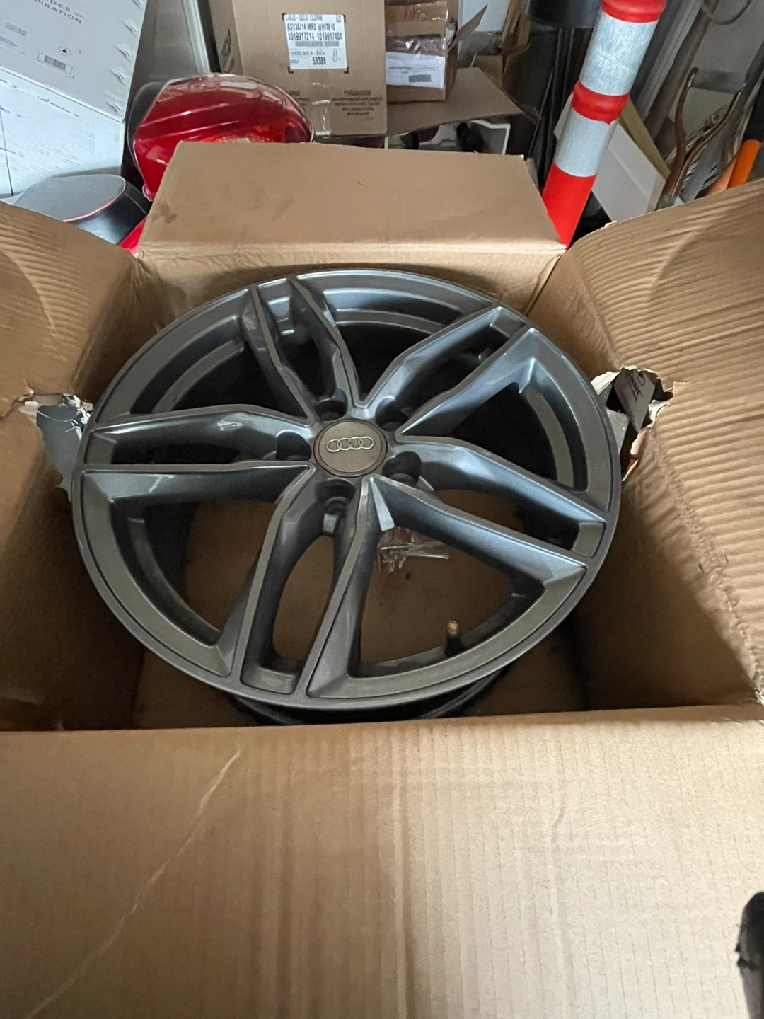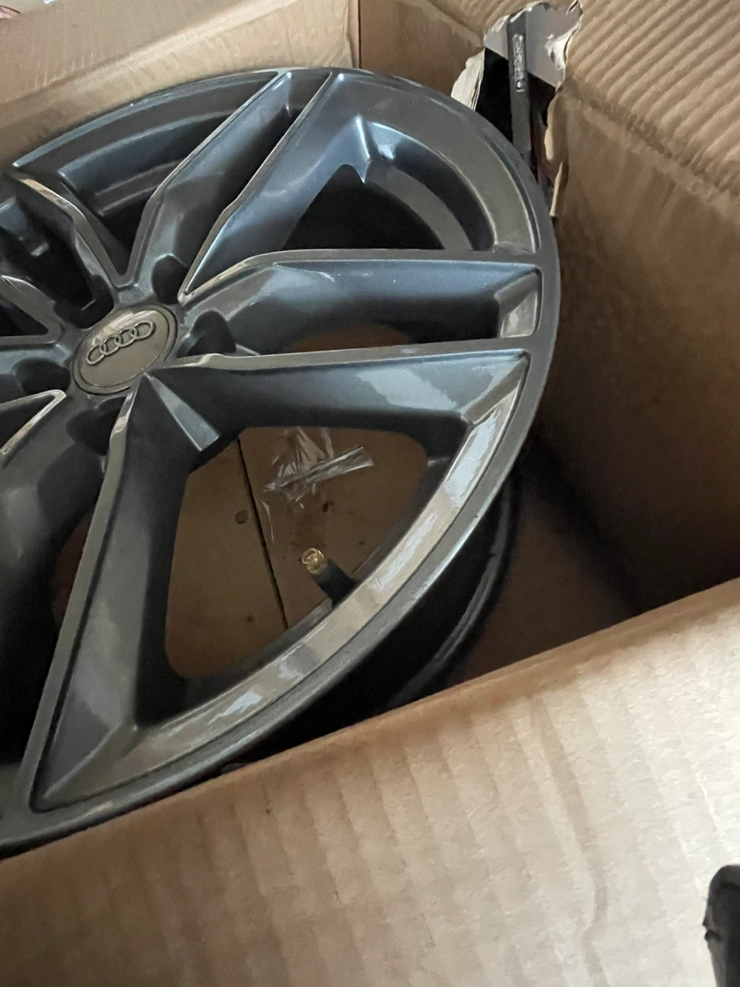 Complete set of four Audi alloy wheel. Greet shape with no curb rash at all of any kind and no damage or corrosion. Selling as they are too small for our car which original size is 19”. My loss is your gain. Like new and stored in original boxes all four.