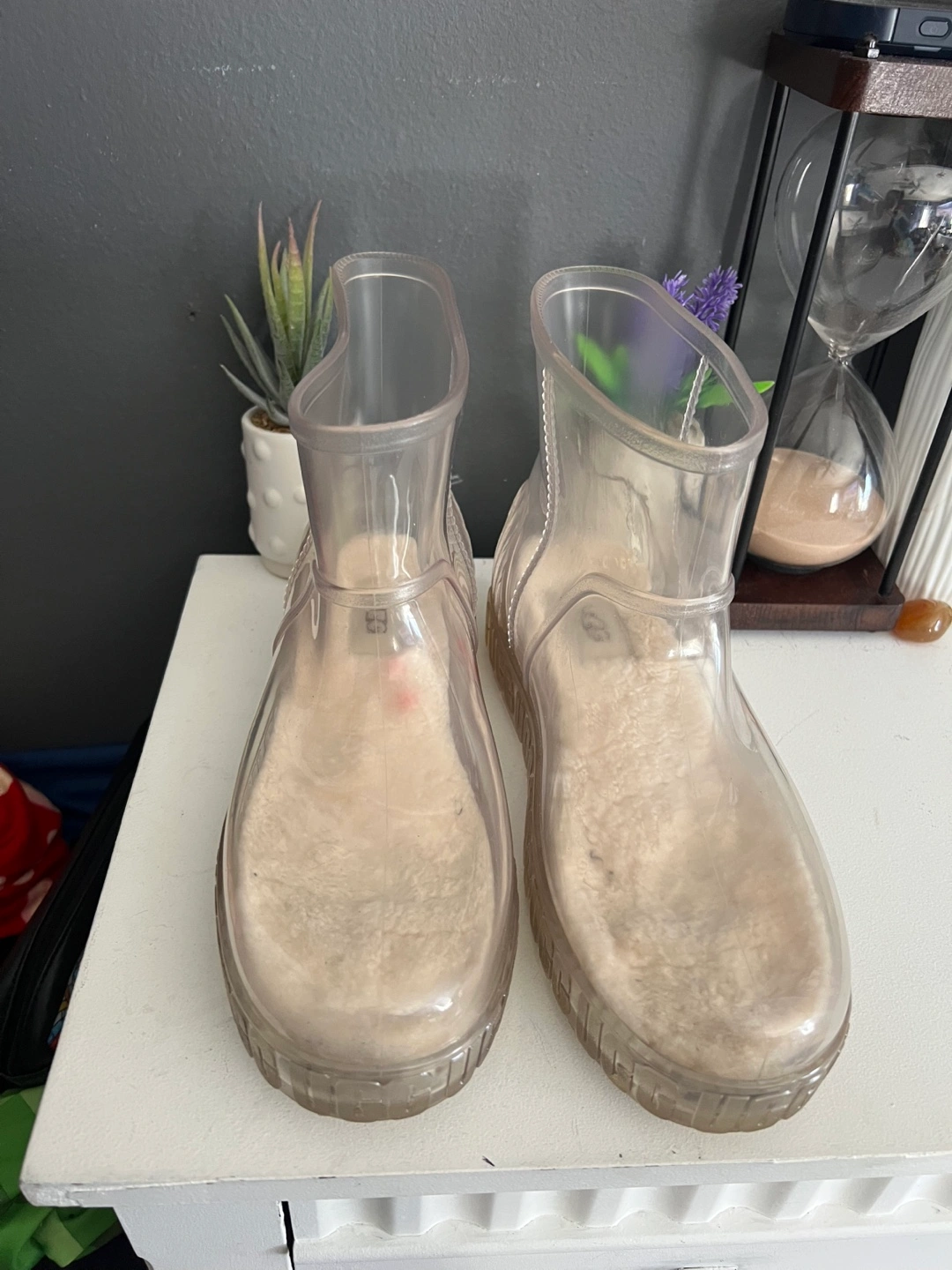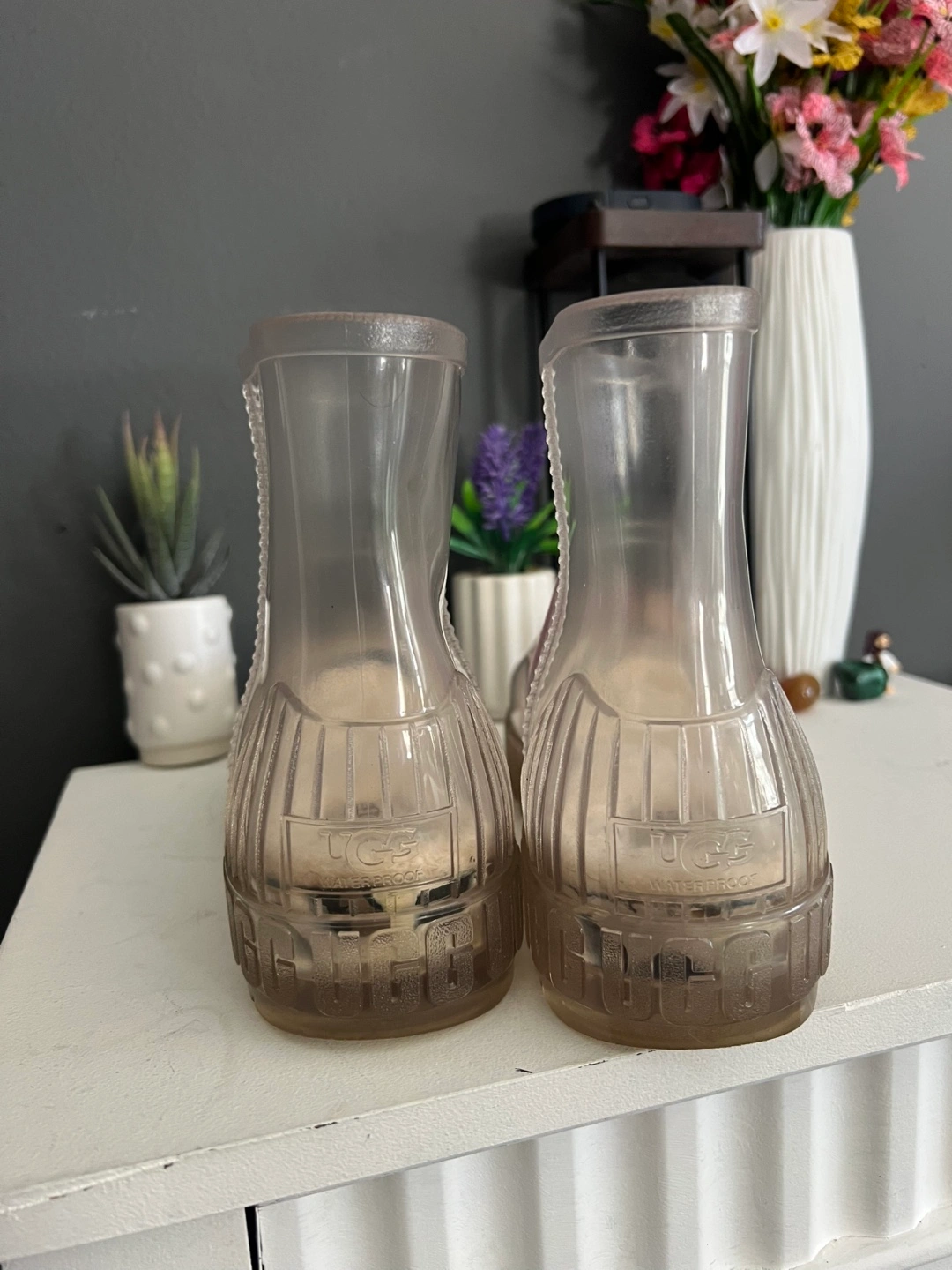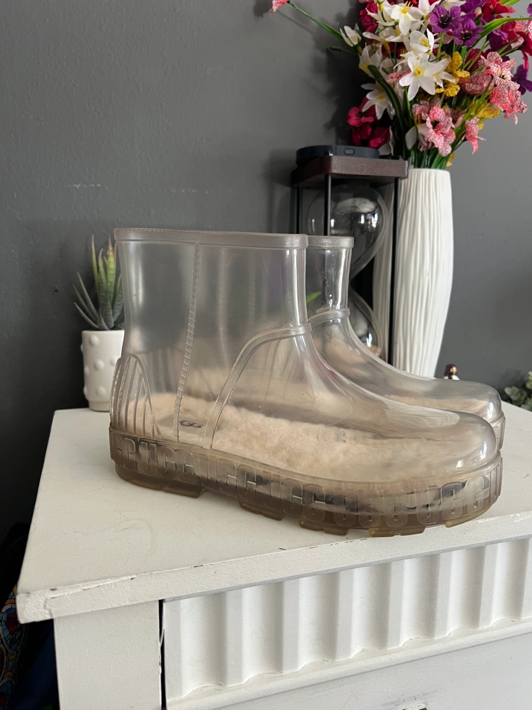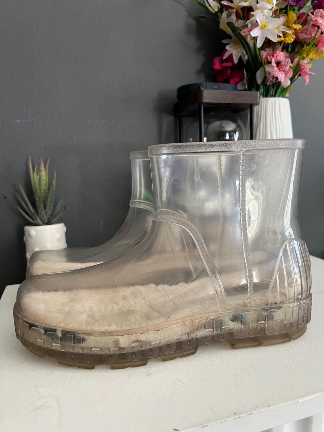 These UGG booties are clear and waterproof. They feature a cozy, sherpa-lined interior. The chunky sole provides good traction. Perfect for rainy days!