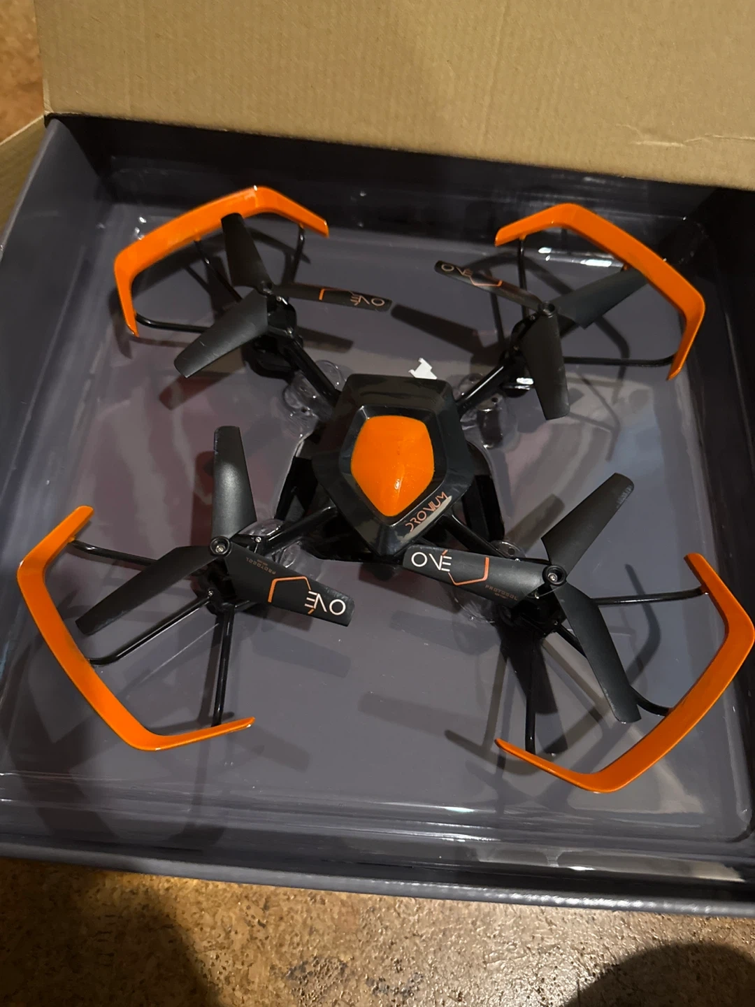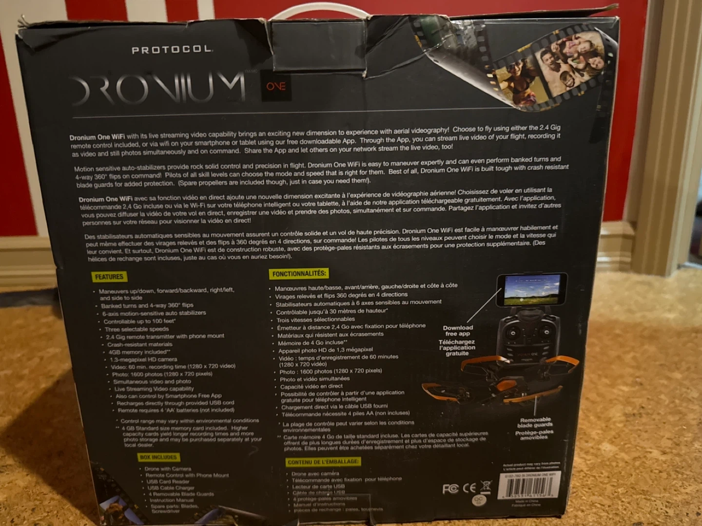 This is the Protocol Dronium One drone, featuring live streaming capabilities and aerial photography. Control using the included controller or via wifi on your phone. It's built with crash-resistant construction. Includes remote control, phone mount, USB cable, spare blades, and guards.