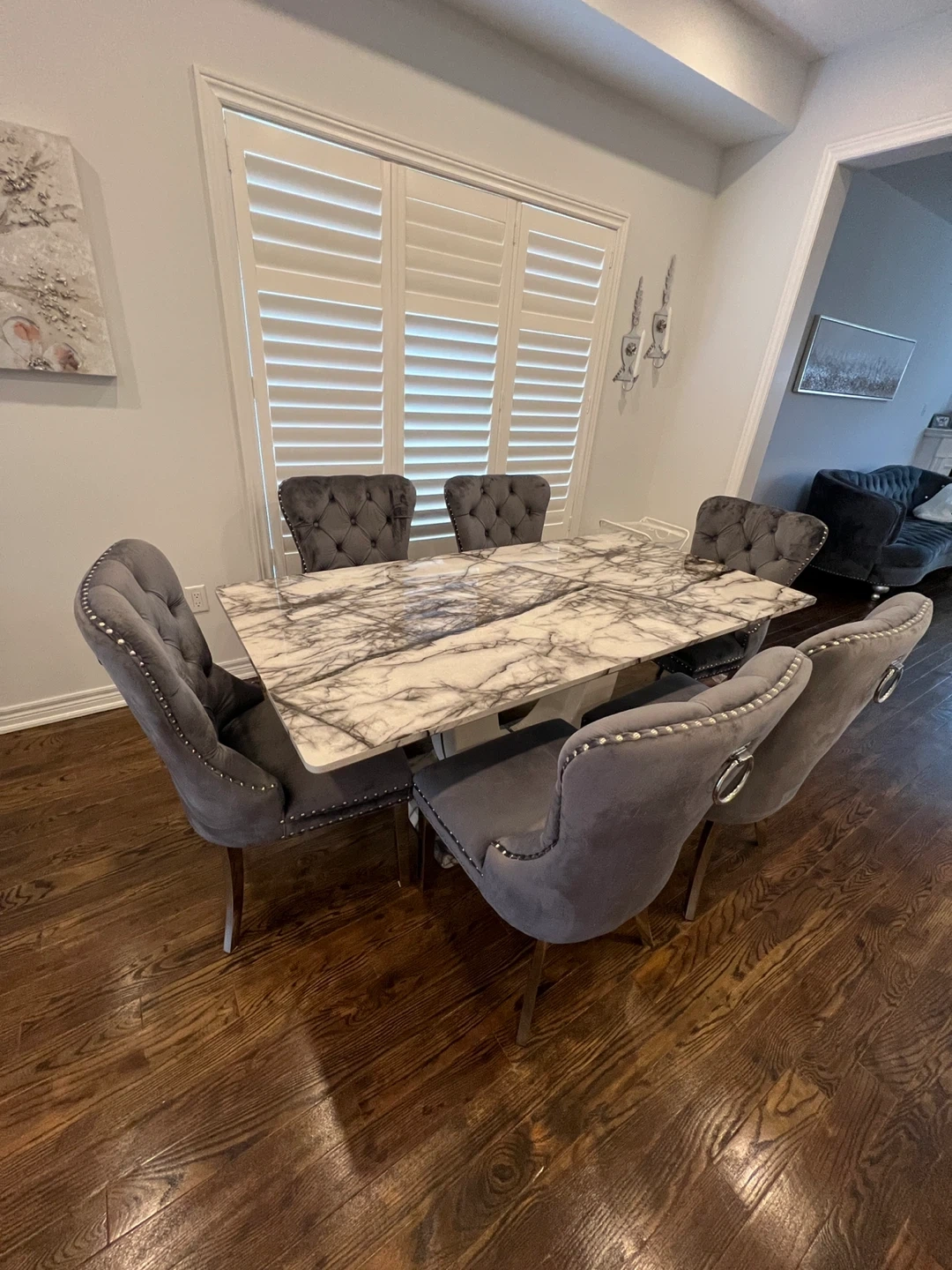 Moving Sale--Marble Dining Table and 6 Grey Velvet Chairs