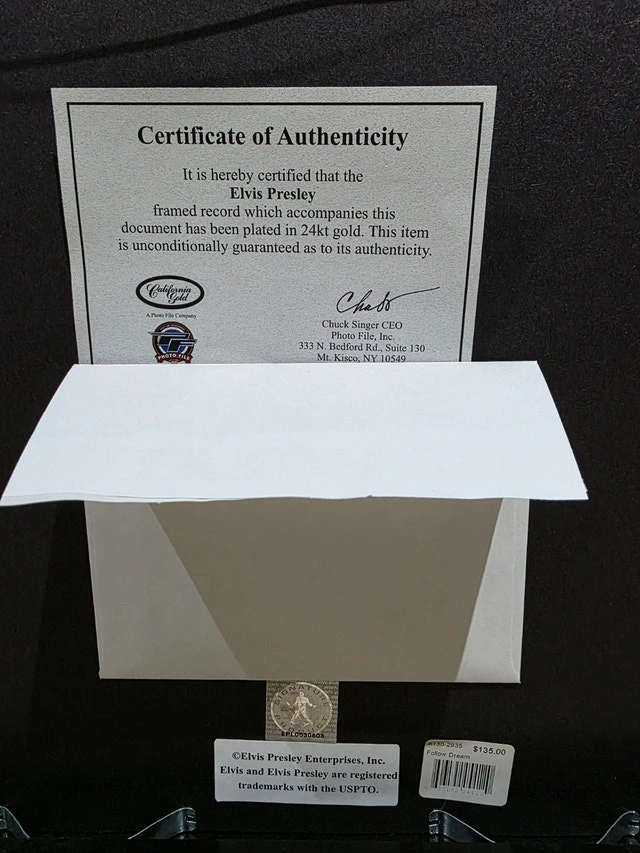 Elvis Presley Follow That Dream 24kt gold plated record with Certificate of Authenticity. Measures 18.5"H x 24.5"W. Purchased at Graceland. Condition: New. Pop Culture Collectibles. Cash accepted.