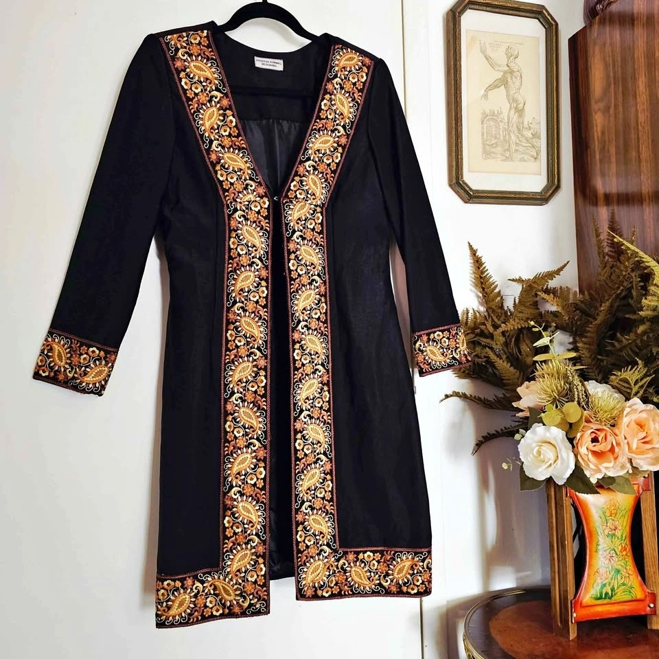 Jacket is expertly tailored with princess seams and a belted-effect embroidered waistline in the back to create a flattering, feminine silhouette. Can be styled open or closed as a dramatic duster coat for traditional outfits or as a bohemian piece to wear over a dress or jeans.