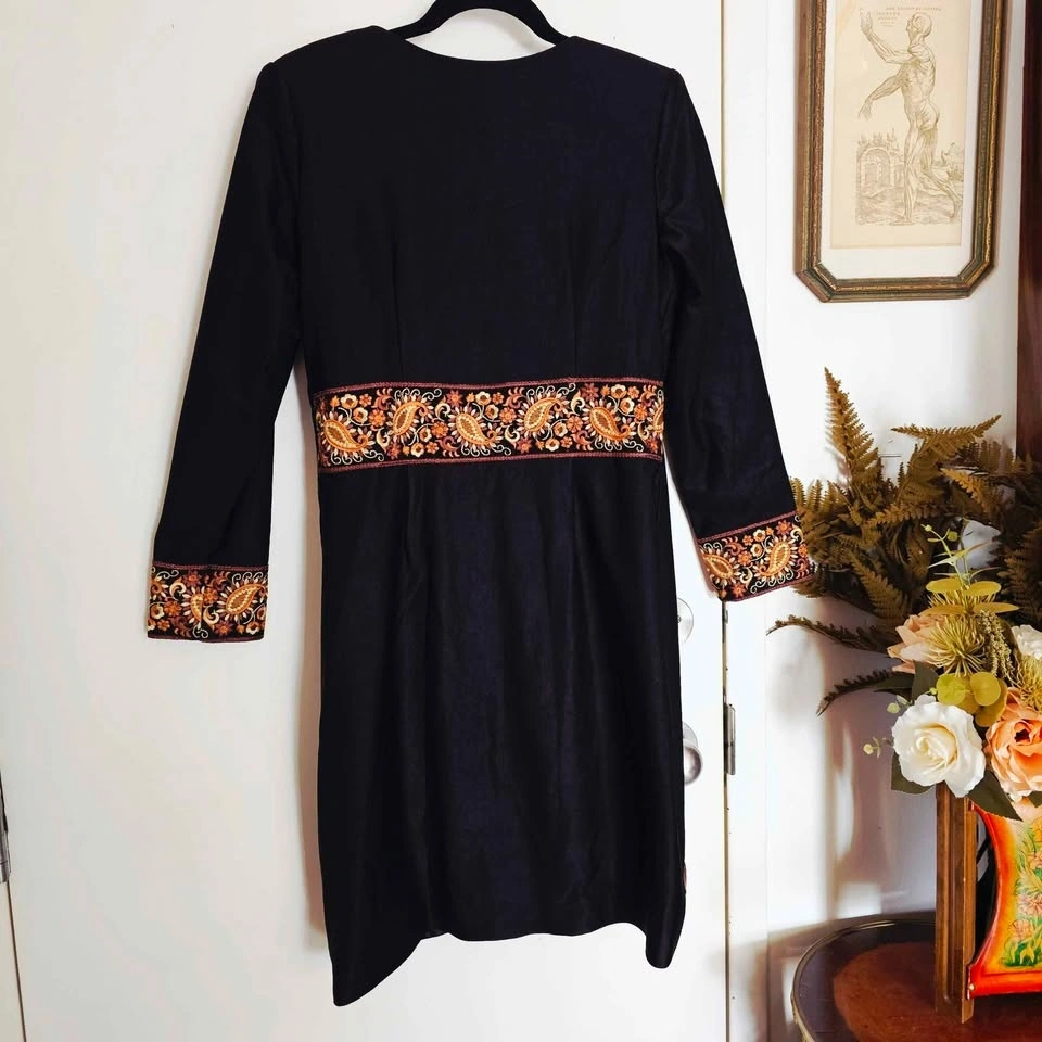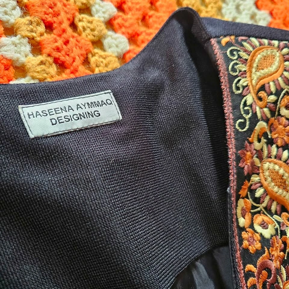 It features bold and intricate embroidery in an earth tone pallette of terracotta, brown, and cream that creates a tapestry effect against a crisp black backdrop. Embroidery features traditional Kashmiri-inspired motifs, specifically the paisley (Kalka) and floral vines.
