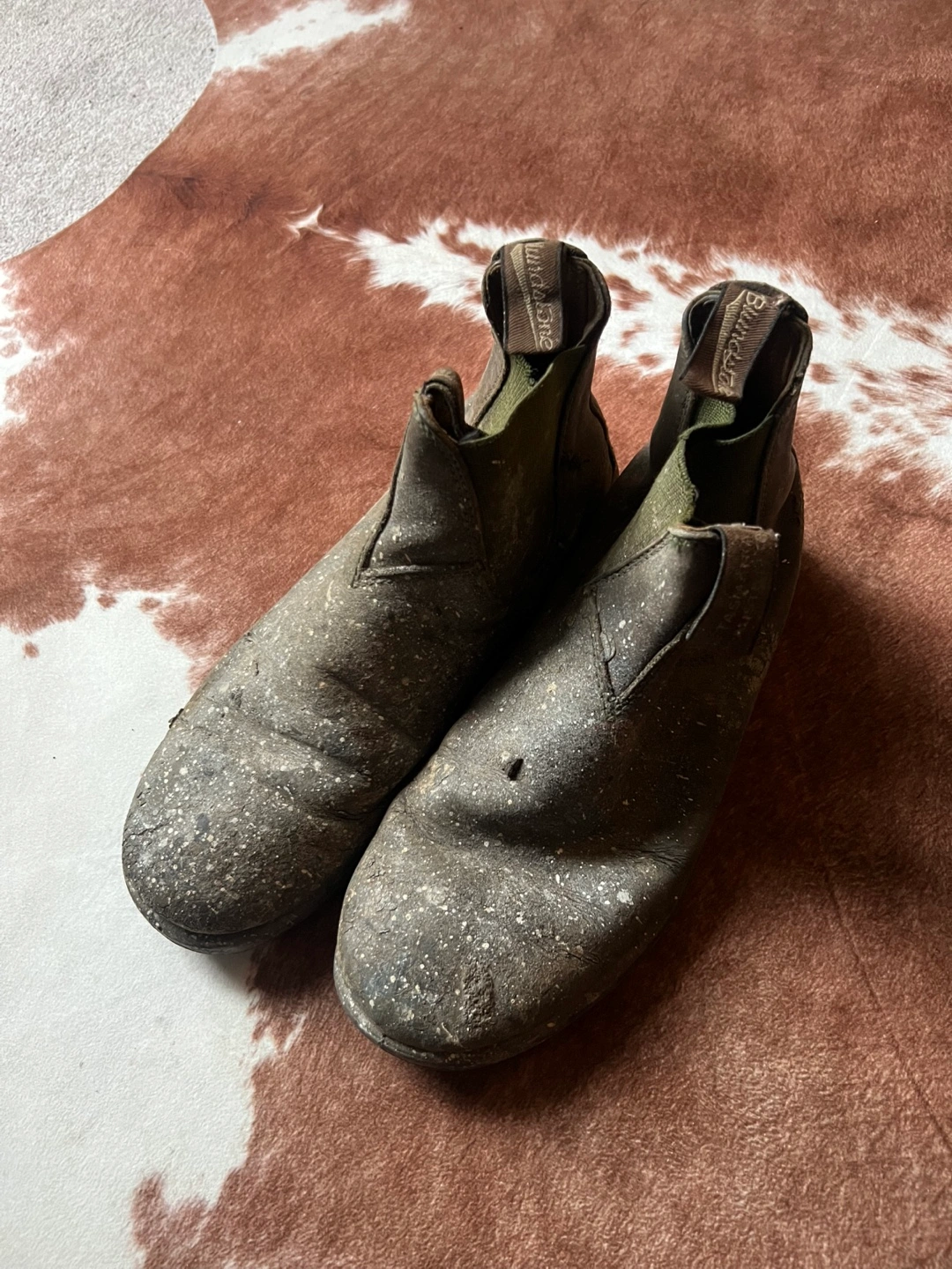 Pair of used Blundstone Chelsea boots. Dark-colored leather, worn and scuffed. Blundstones have a lifetime warranty so if you can figure out how to get a new pair, this is a good way.