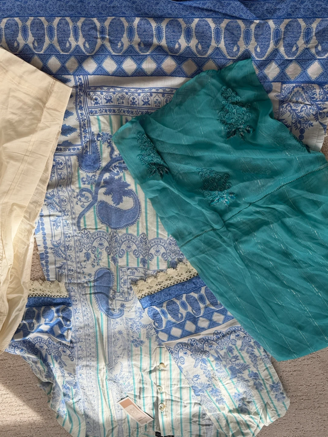 Three-piece J. suite featuring a blue and white striped kurti with intricate paisley and floral prints. It's accented with pearl-like buttons and lace trim on the sleeves. Comes with a teal chiffon dupatta and cream trousers. Dry clean only.