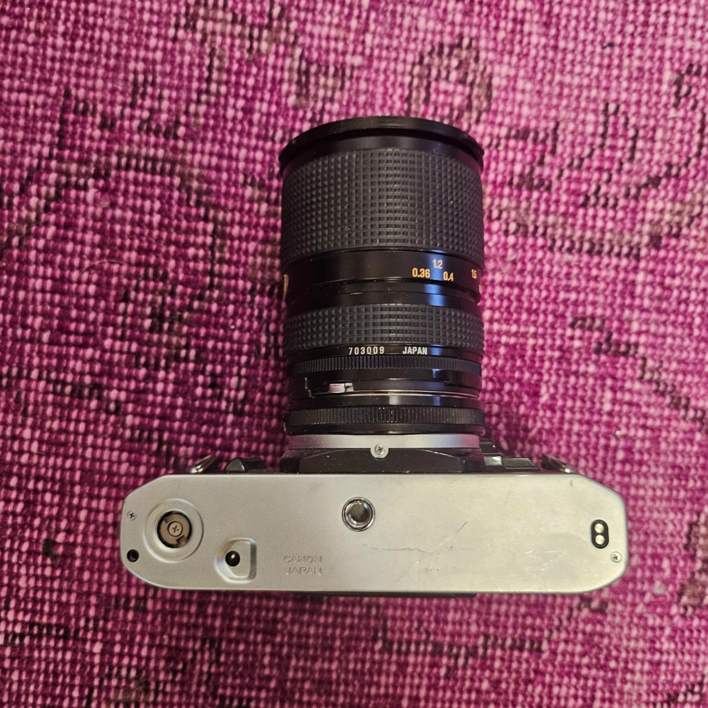 This is a vintage Canon AE-1 Program 35mm Single-Lens Reflex (SLR) film camera. It comes with a 28-80mm zoom lens. The camera body is silver and black with a textured grip. It includes a neck strap.