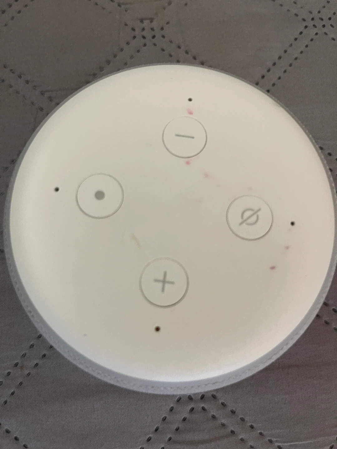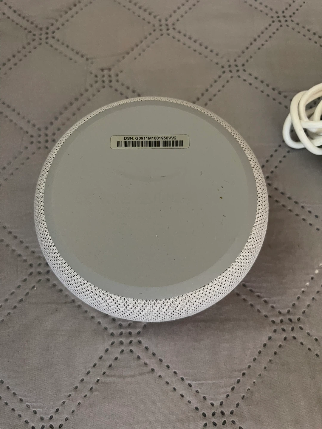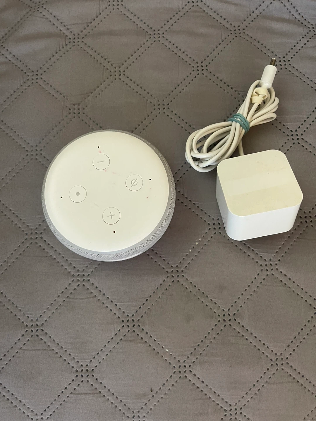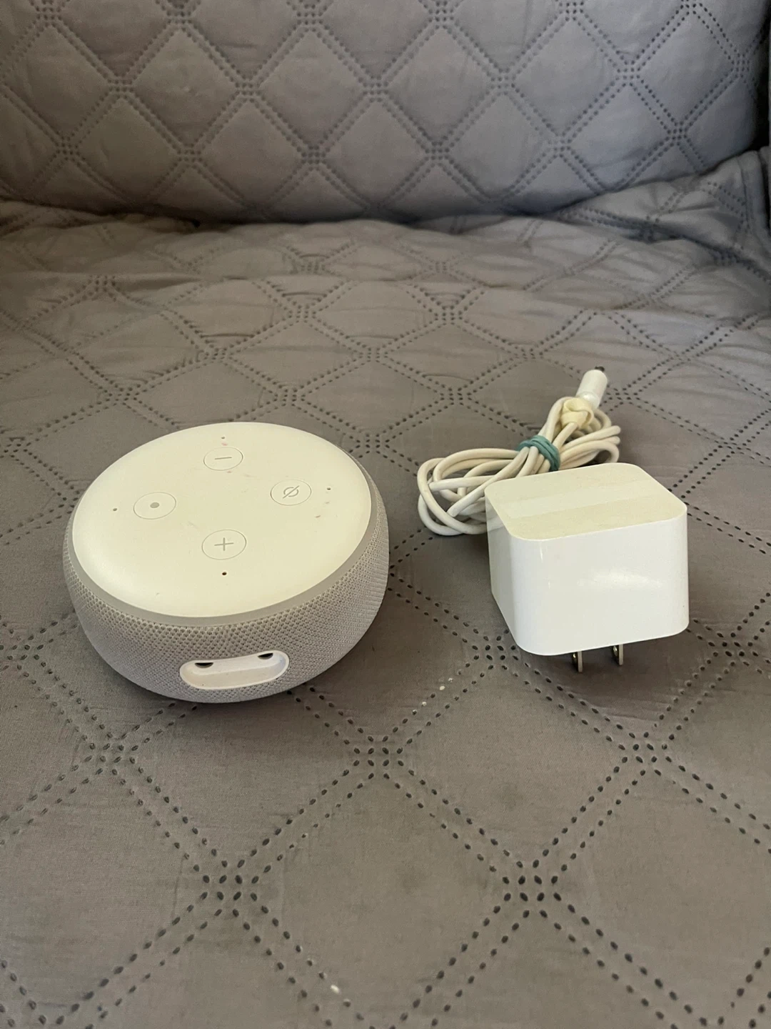 It's an Amazon Echo Dot, 3rd generation, in charcoal grey. Includes the power adapter and cable. Connects to Wi-Fi for voice commands.