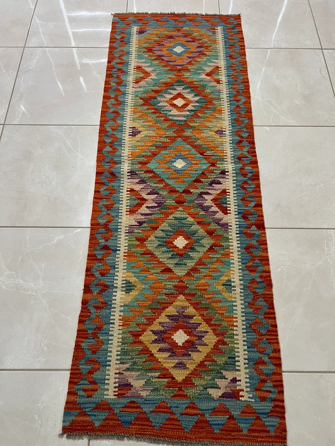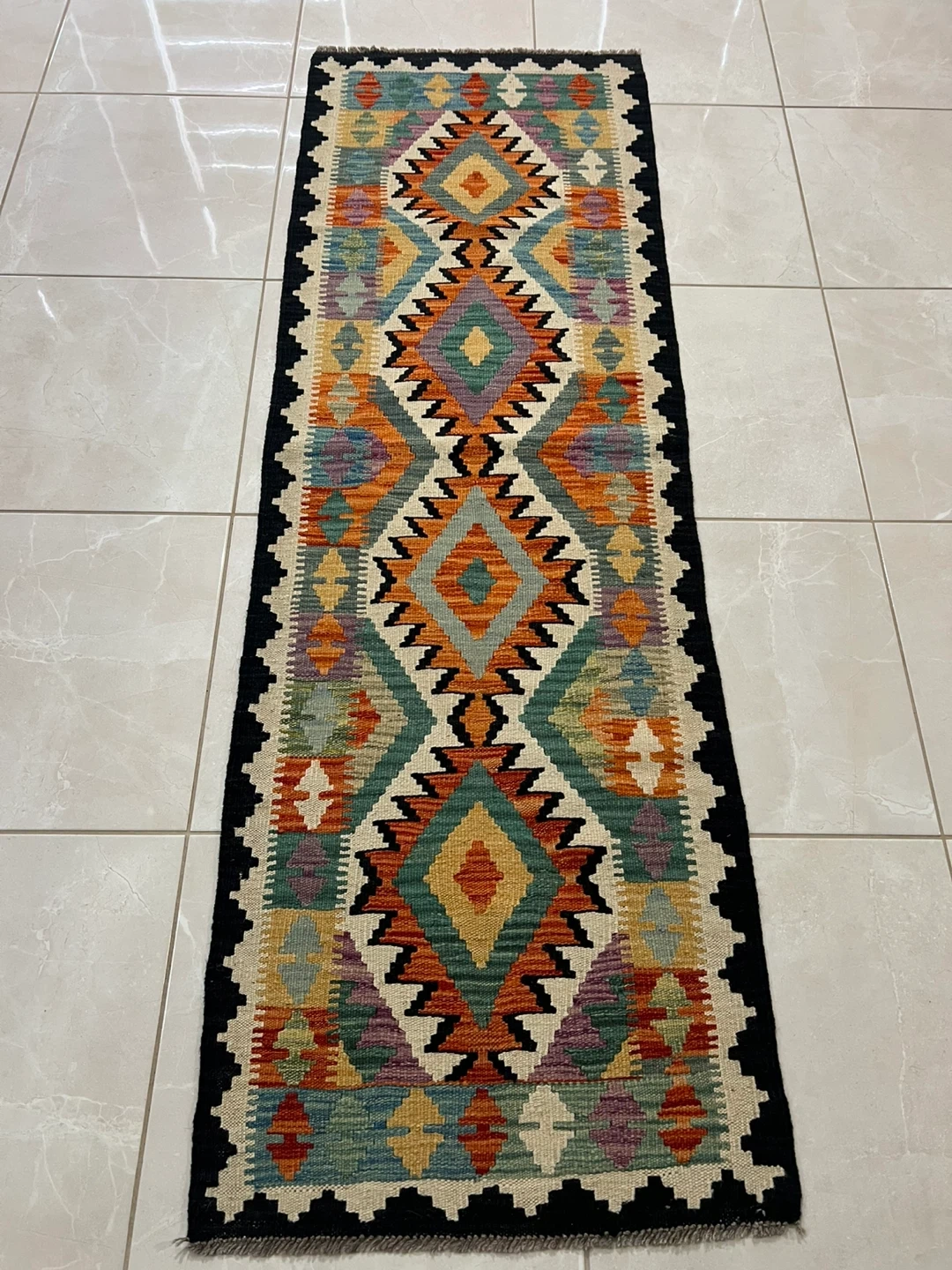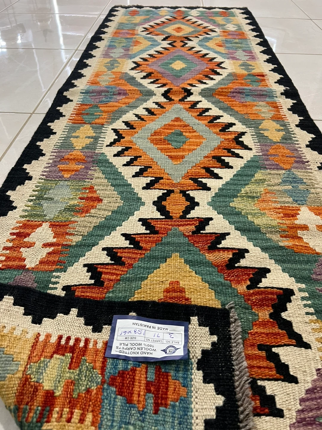 Three beautiful hand-knotted runner rug made from 100% wool. It features a vibrant geometric pattern with a variety of colours. It's perfect for adding a cozy touch to hallways or entryways. The rug measures 2*6 ft