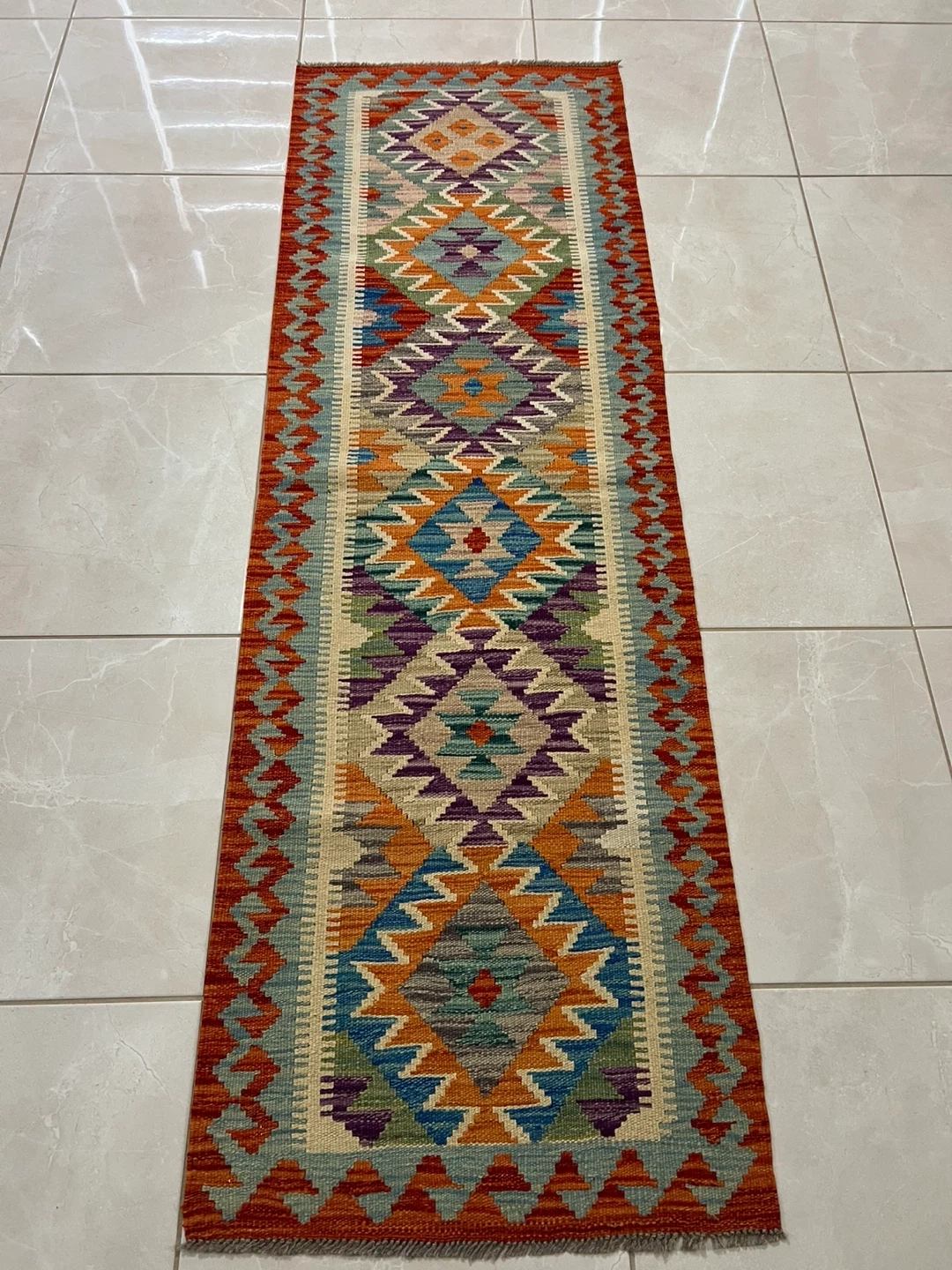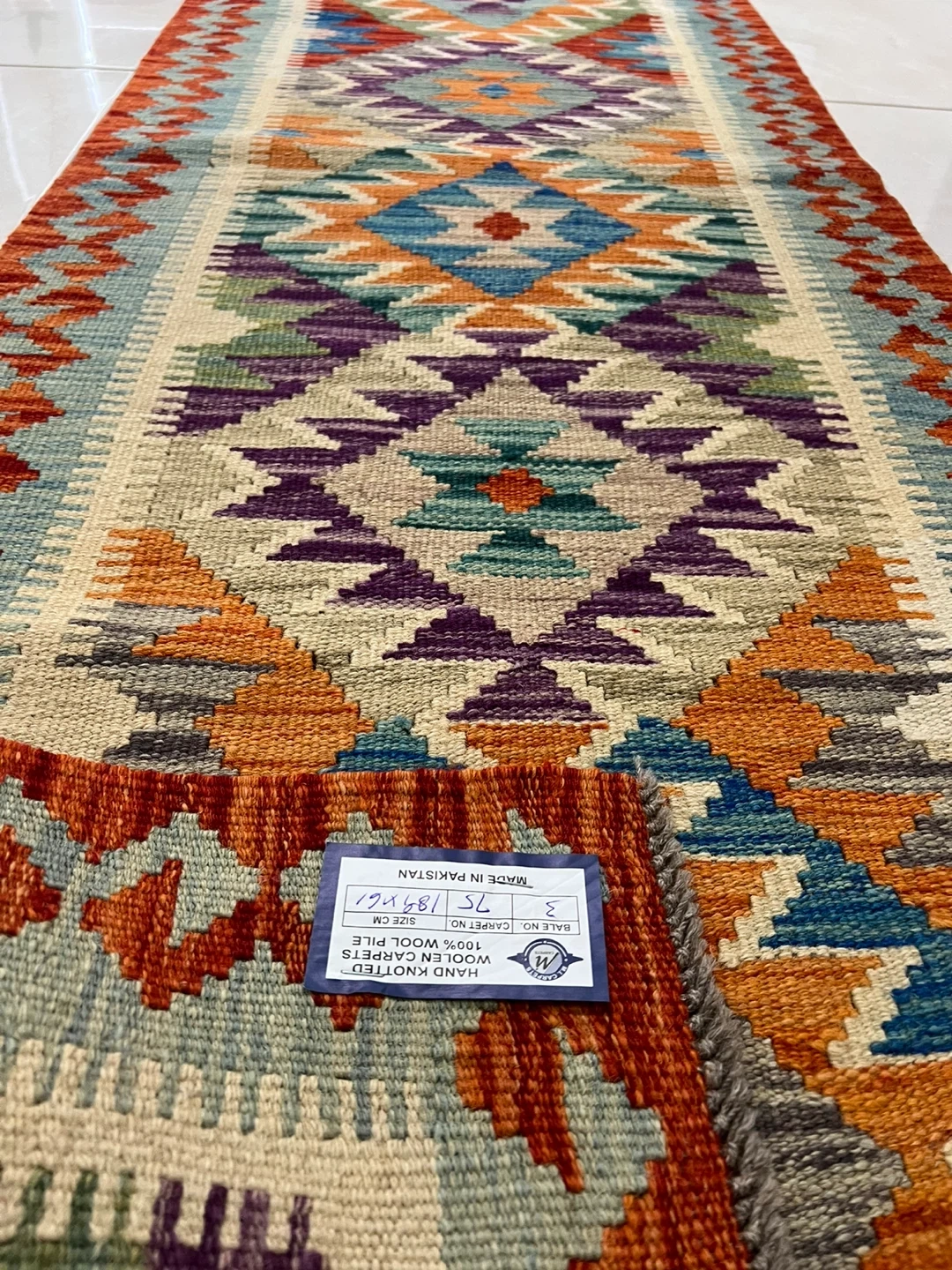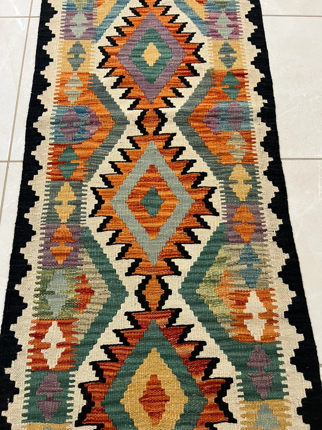 Three beautiful hand-knotted runner rug made from 100% wool. It features a vibrant geometric pattern with a variety of colours. It's perfect for adding a cozy touch to hallways or entryways. The rug measures 2*6 ft