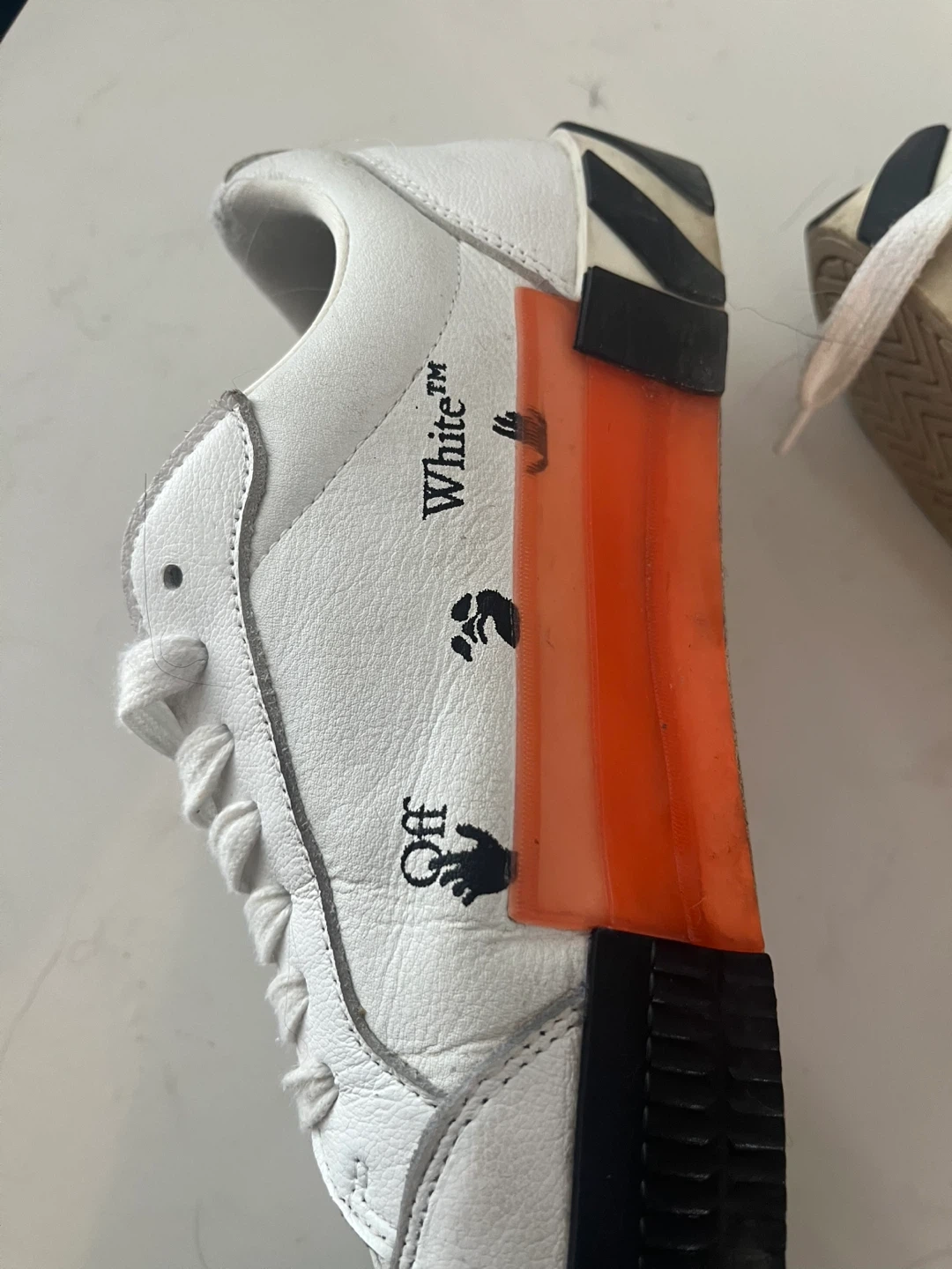 These are Off-White low top sneakers in white leather. They feature the signature Off-White diagonal stripes on the sole and branding on the sides. The laces are marked "SHOELACES".