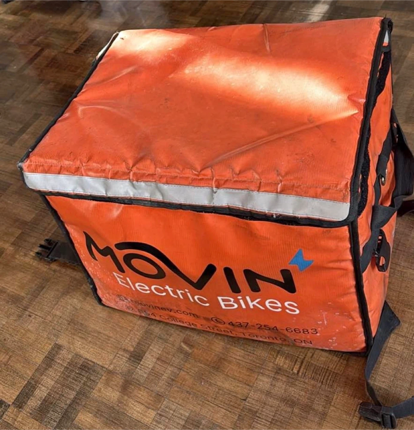 This orange delivery bag is branded Movin Electric Bikes. It's ideal for carrying food or other items during deliveries. The bag features reflective trim for increased visibility.