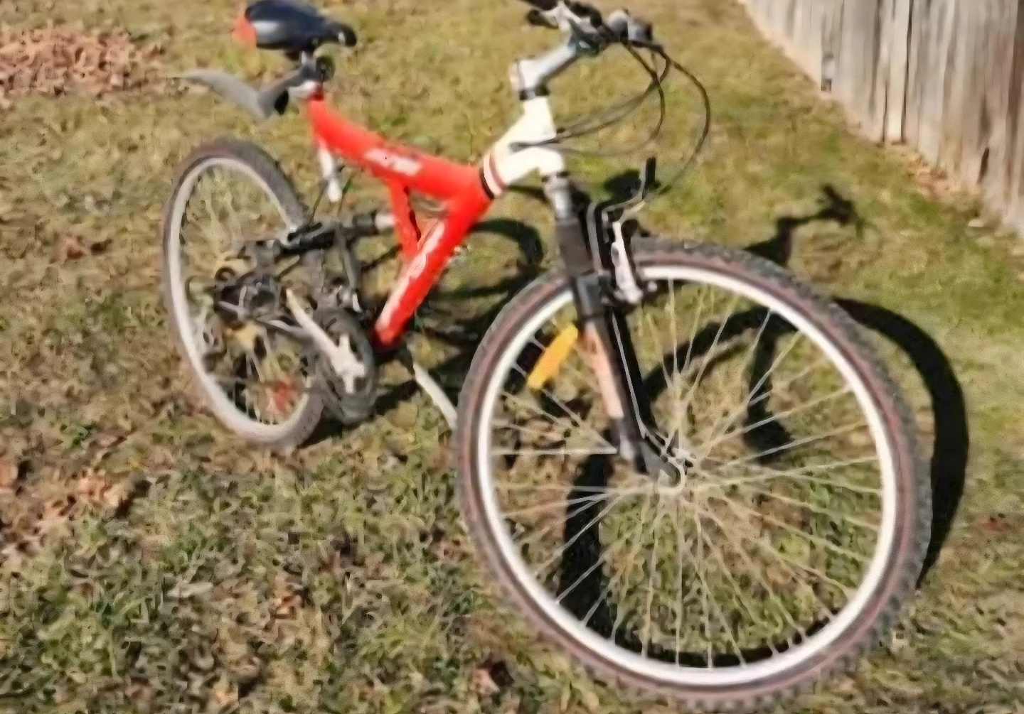 This is a red mountain bike. It has a suspension fork. It's ready for some trails! Flat tire needs patch or new tube 21inch. Price firm. All info in add. Thx