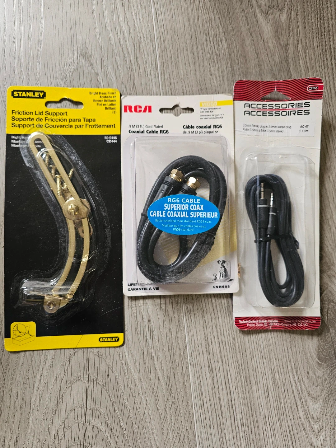 Includes two new RCA 9 M (3 ft) RG6 Gold Plated Coaxial Cables, one RCA 2-Way Signal Splitter (5-900 MHz), and a new Stanley Bright Brass Friction Lid Support. Also a new 3.5mm Stereo to 3.5mm Stereo Cable is included. It's great for home entertainment setups!