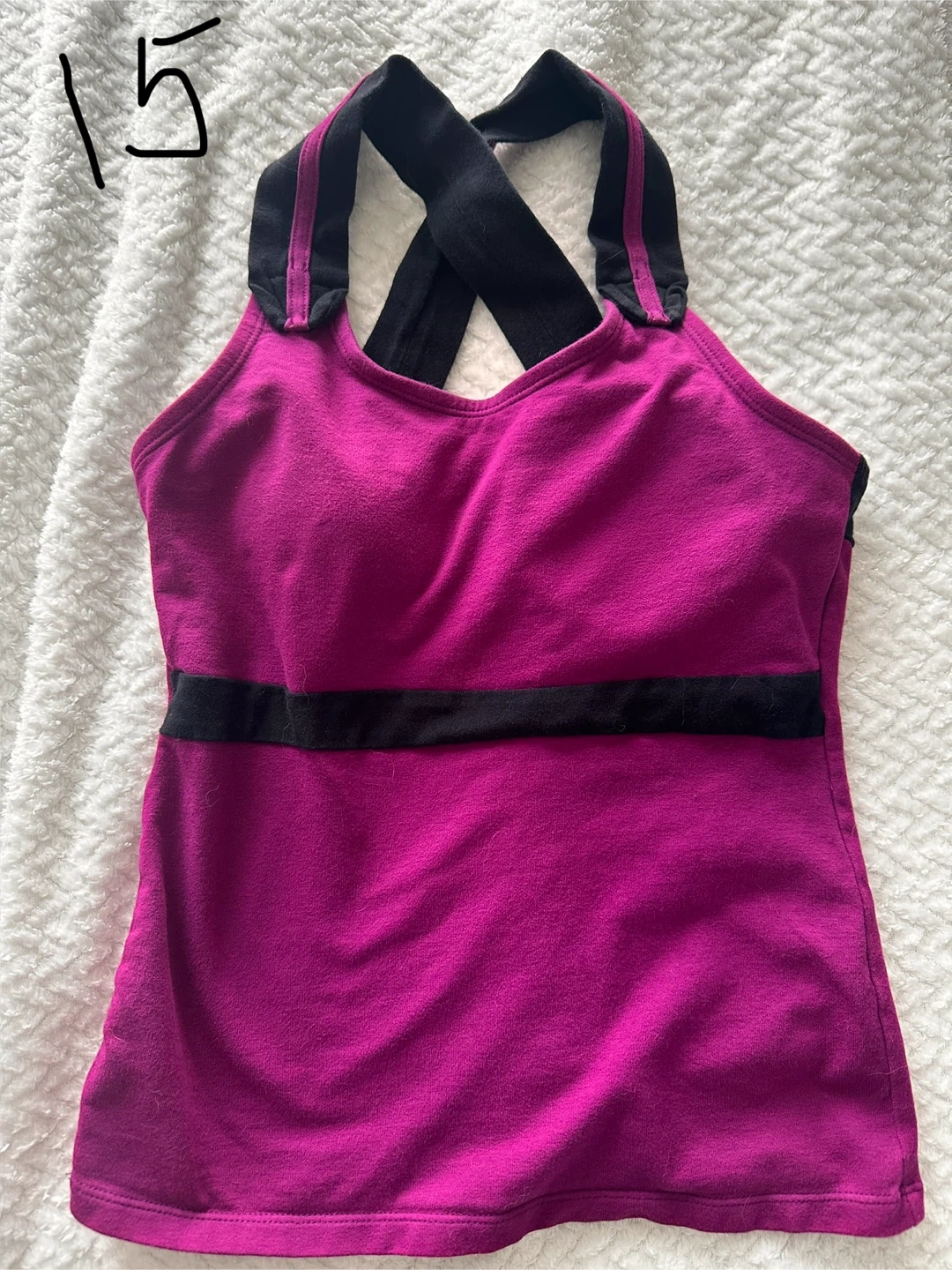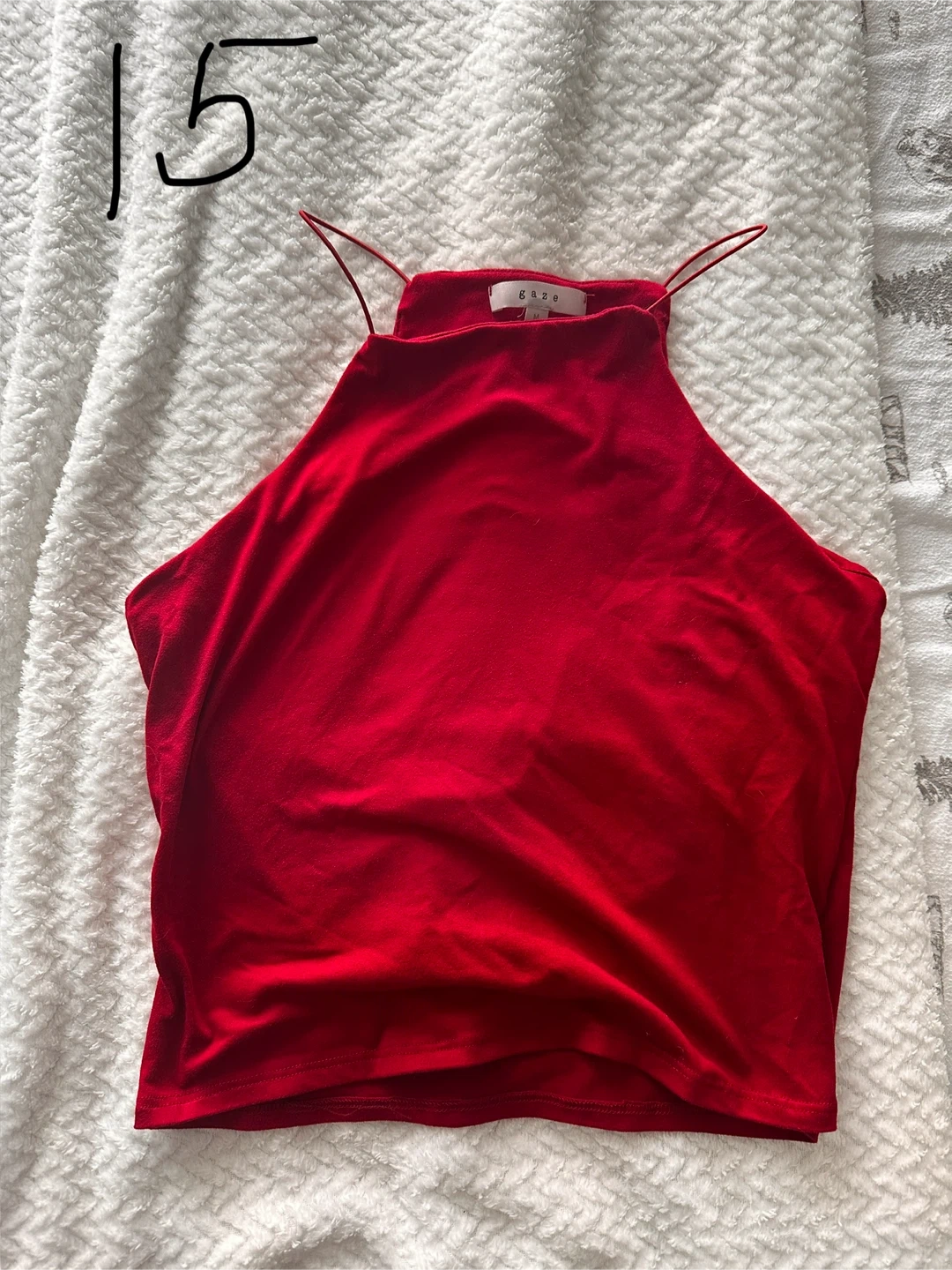 Three tank tops in various colours. The blue top has a halter neck. The red top has thin spaghetti straps. The magenta top features a criss-cross back strap design. These tops are great for casual wear or layering. Only $30 for three items.