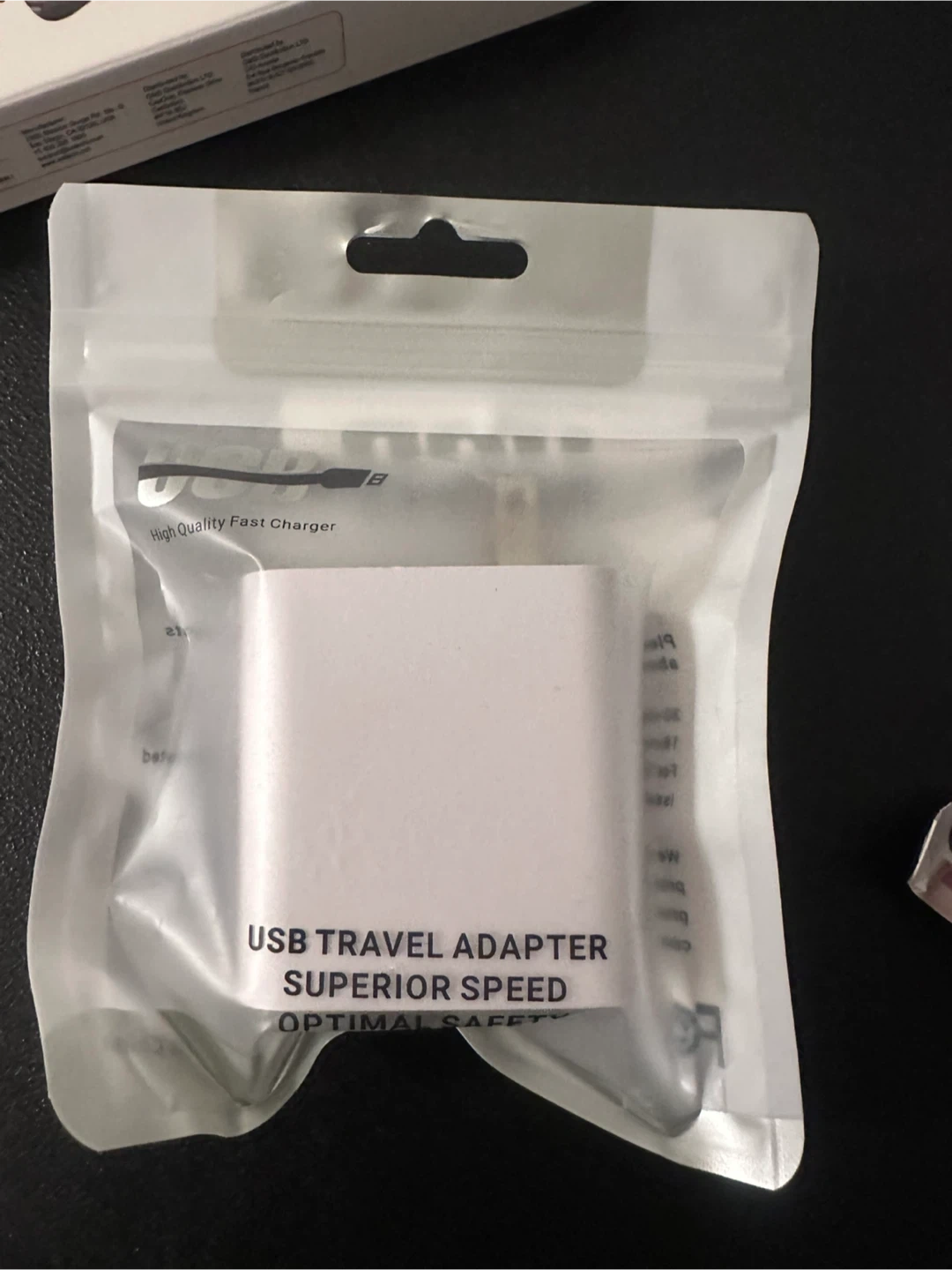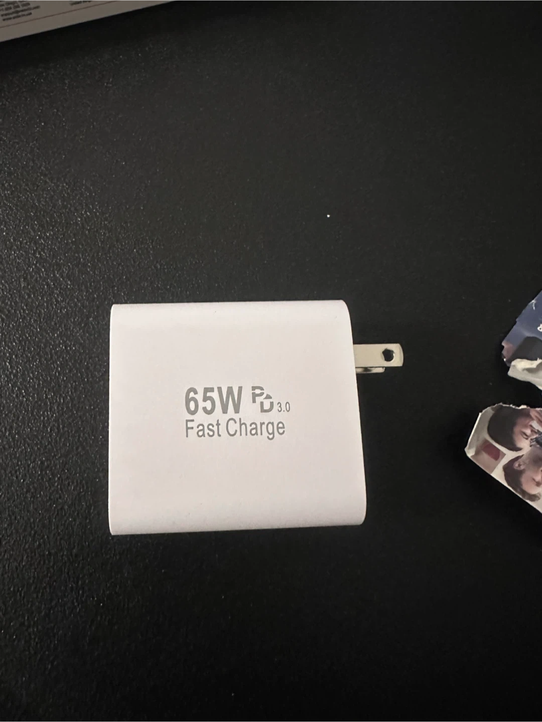 This is a 65W PD 3.0 fast charge USB travel adapter. It's white and has superior speed with optimal safety. It comes with multiple ports for charging different devices.