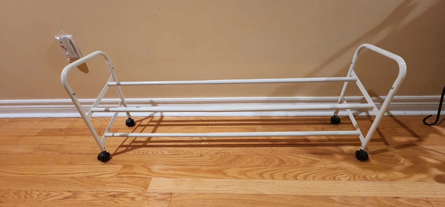 White metal shoe rack with 2 tiers. It has wheels for easy movement and it's collapsable/expandable. This rack is great for organizing footwear in your entryway or closet.