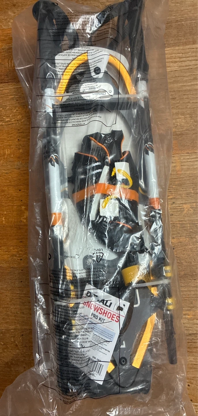 This is a brand new w tags in sealed packaging, Denali Snowshoes Pro Kit. Includes aluminum snowshoes with a binding system. Comes with poles and gear bag. Bag has backpack straps and molded handle for easy transport.