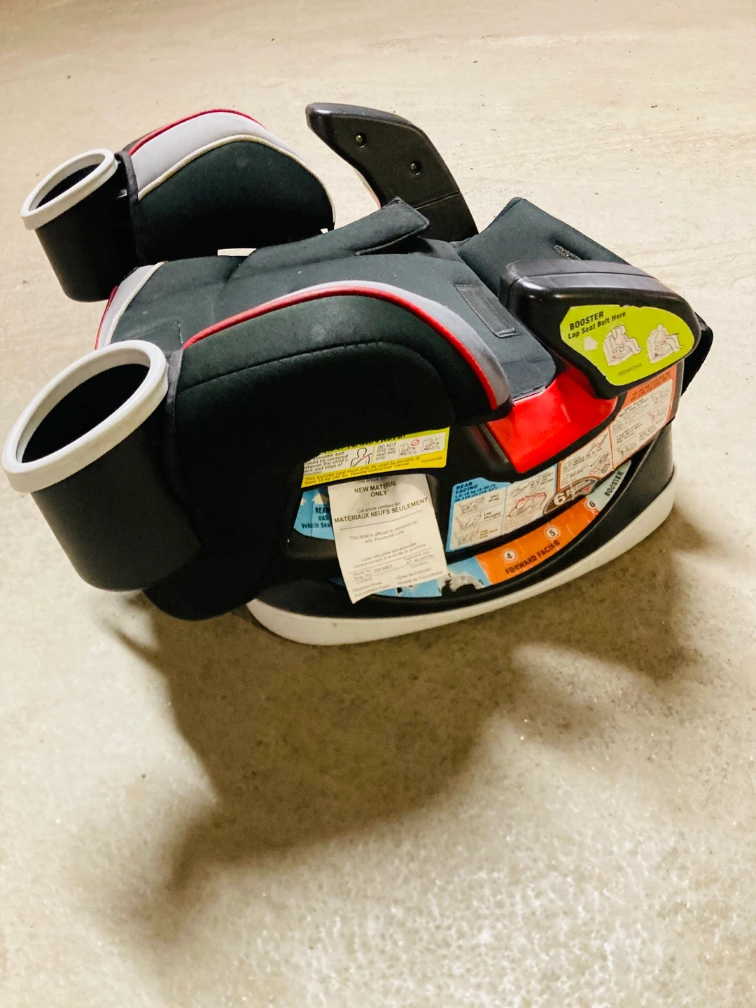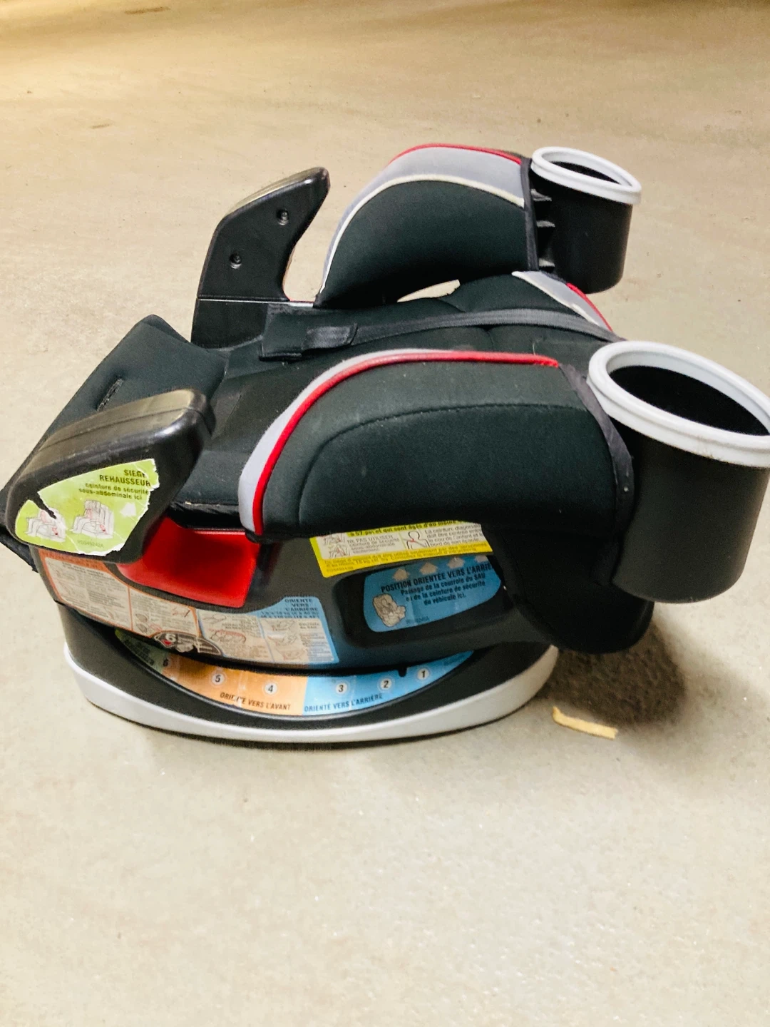 This is an Evenflo 4Ever booster car seat. It's a model with two built-in cup holders. The seat has adjustable armrests for comfort.
