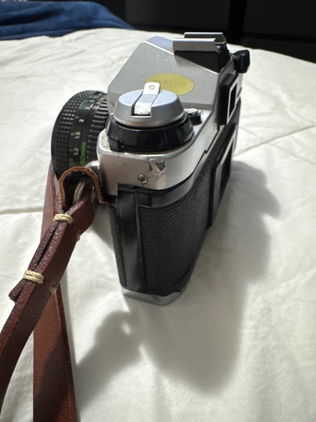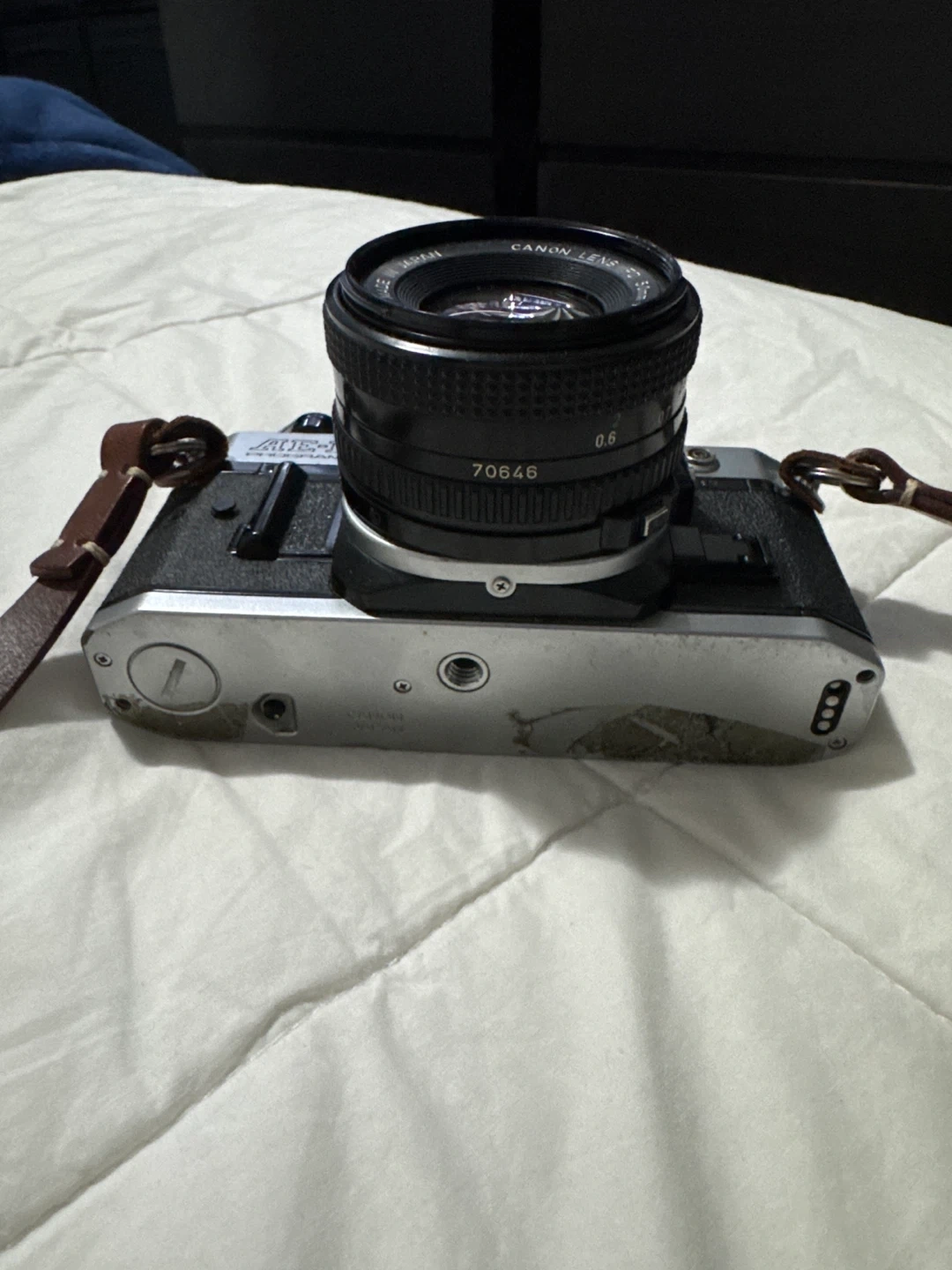 Selling a used Canon AE-1 Program 35mm film camera. It comes with a Canon Lens FD 50mm 1:1.8 lens and strap. There are some signs of wear and tape residue on the bottom, but it works great