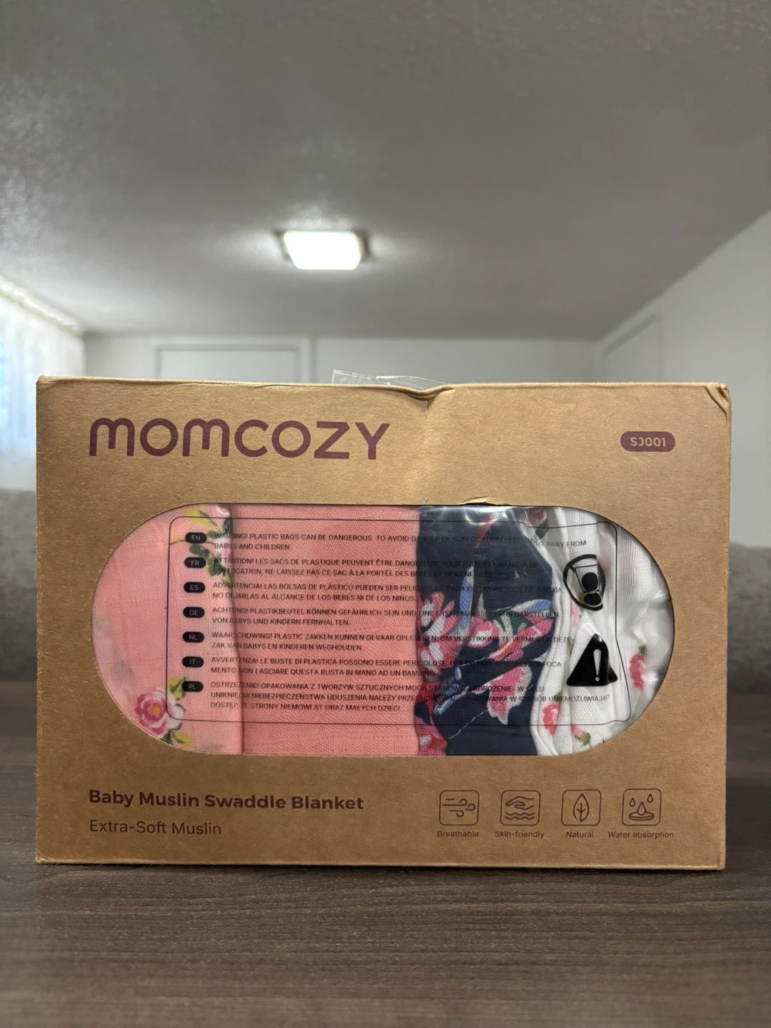 This is a set of Momcozy baby muslin swaddle blankets in an extra-soft muslin material. They are breathable, skin-friendly, natural, and have water absorption.