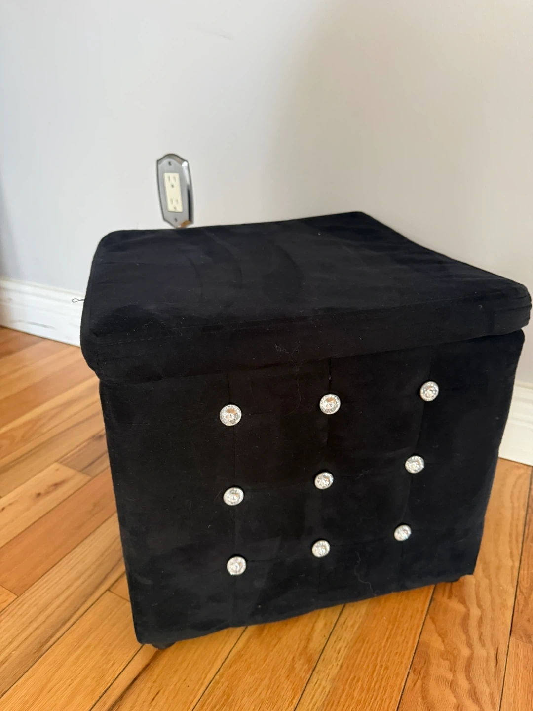 This black storage ottoman is upholstered in a soft velvet material and features decorative crystal buttons. It's perfect for stashing blankets, pillows, or other household items. The lid provides a convenient place to sit or rest your feet.