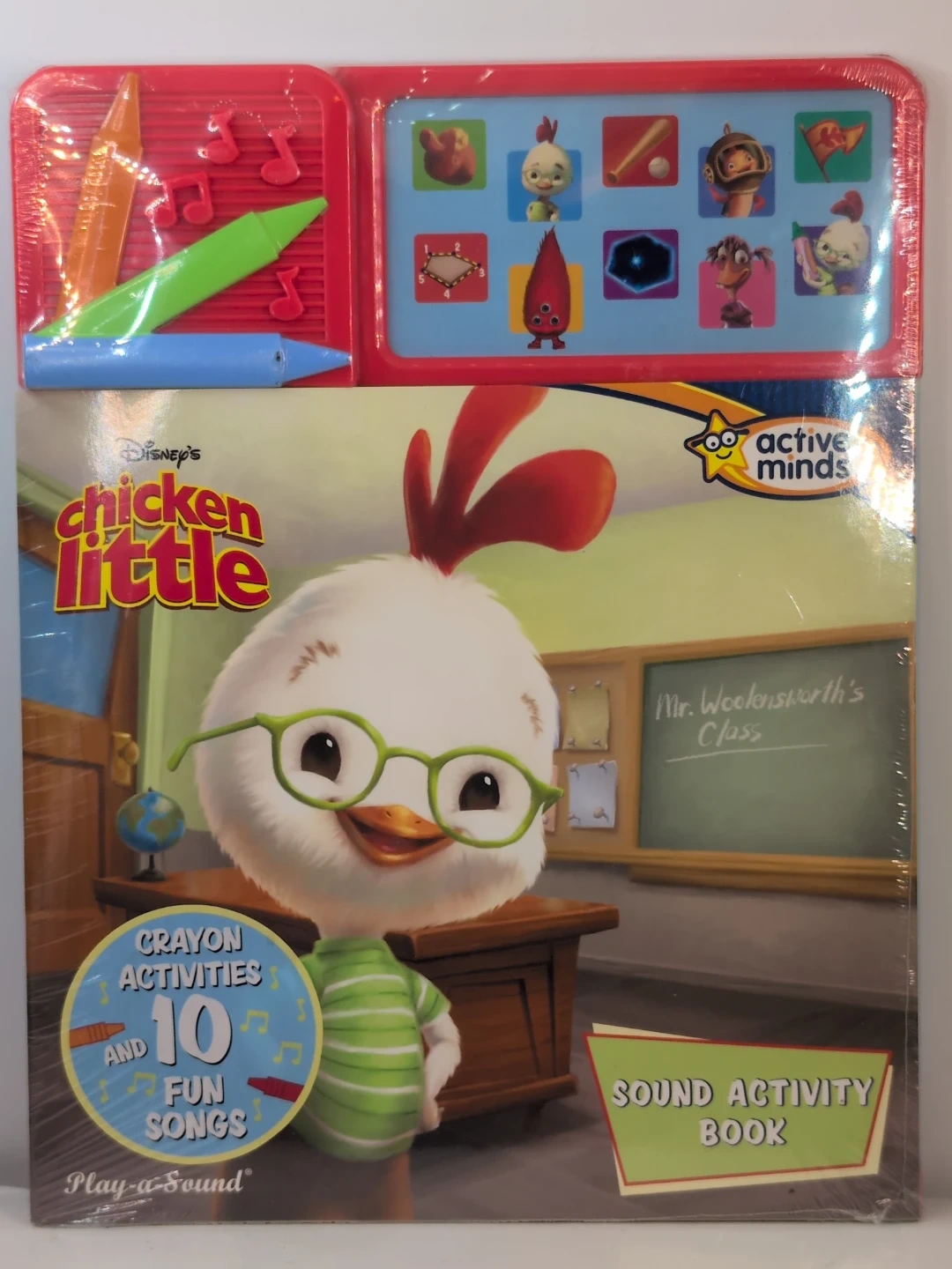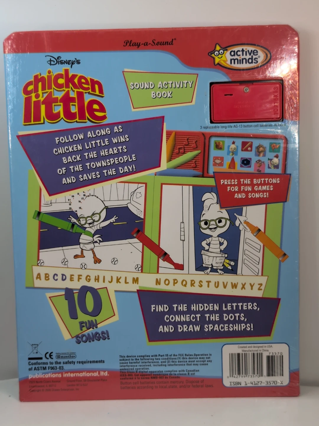 This Disney's Chicken Little sound activity book lets you follow along as Chicken Little wins back the hearts of the townspeople and saves the day. It includes crayon activities and 10 fun songs to enjoy. Find the hidden letters, connect the dots, and draw spaceships!