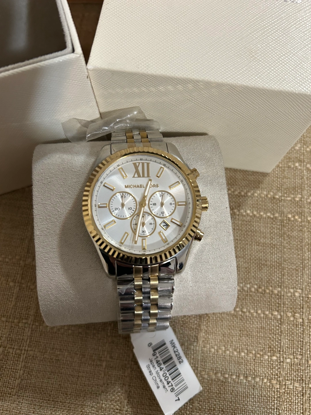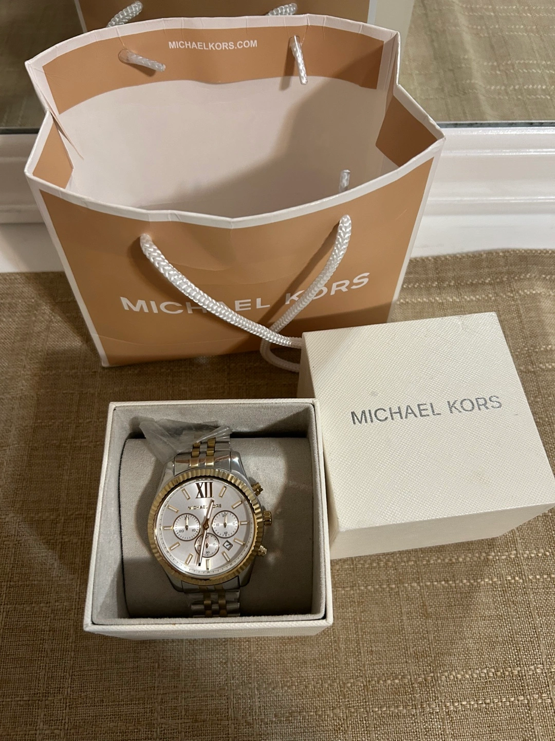 Brand new Michael Kors men's watch. Two-tone stainless steel band. White face with chronograph function. Comes with box and shopping bag.
