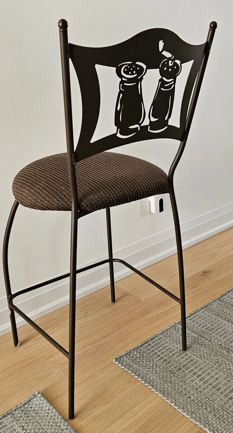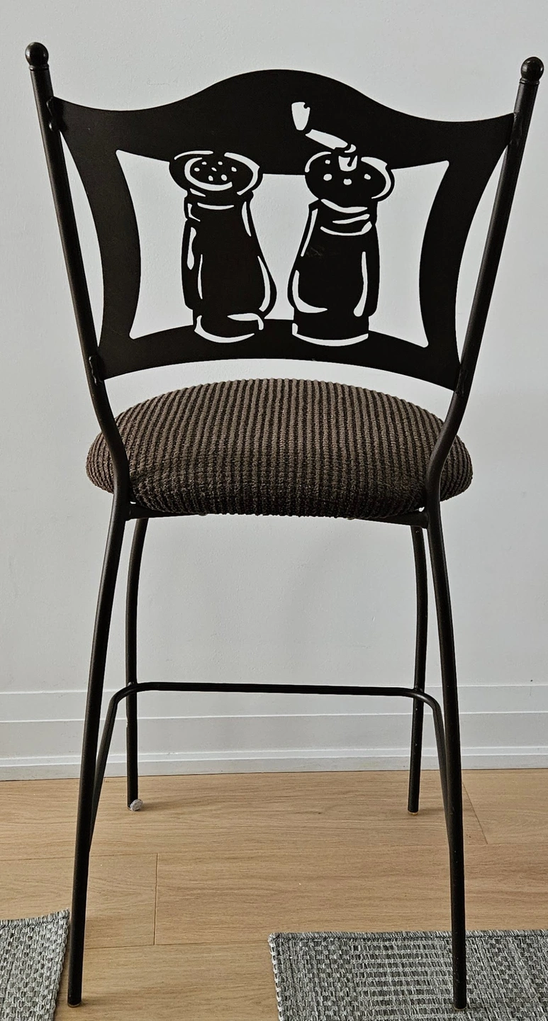 Bistro metal kitchen chairs with a unique salt and pepper shaker design on the backrest. The seats are upholstered in a brown fabric. They're in good condition.