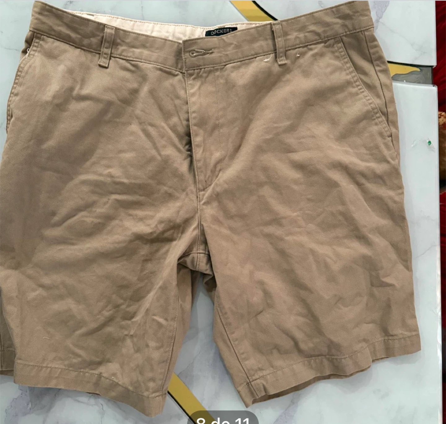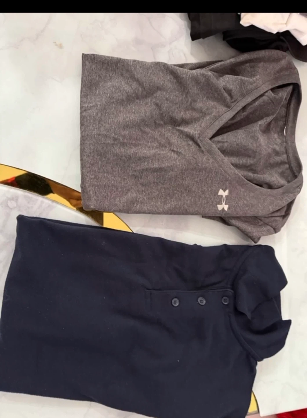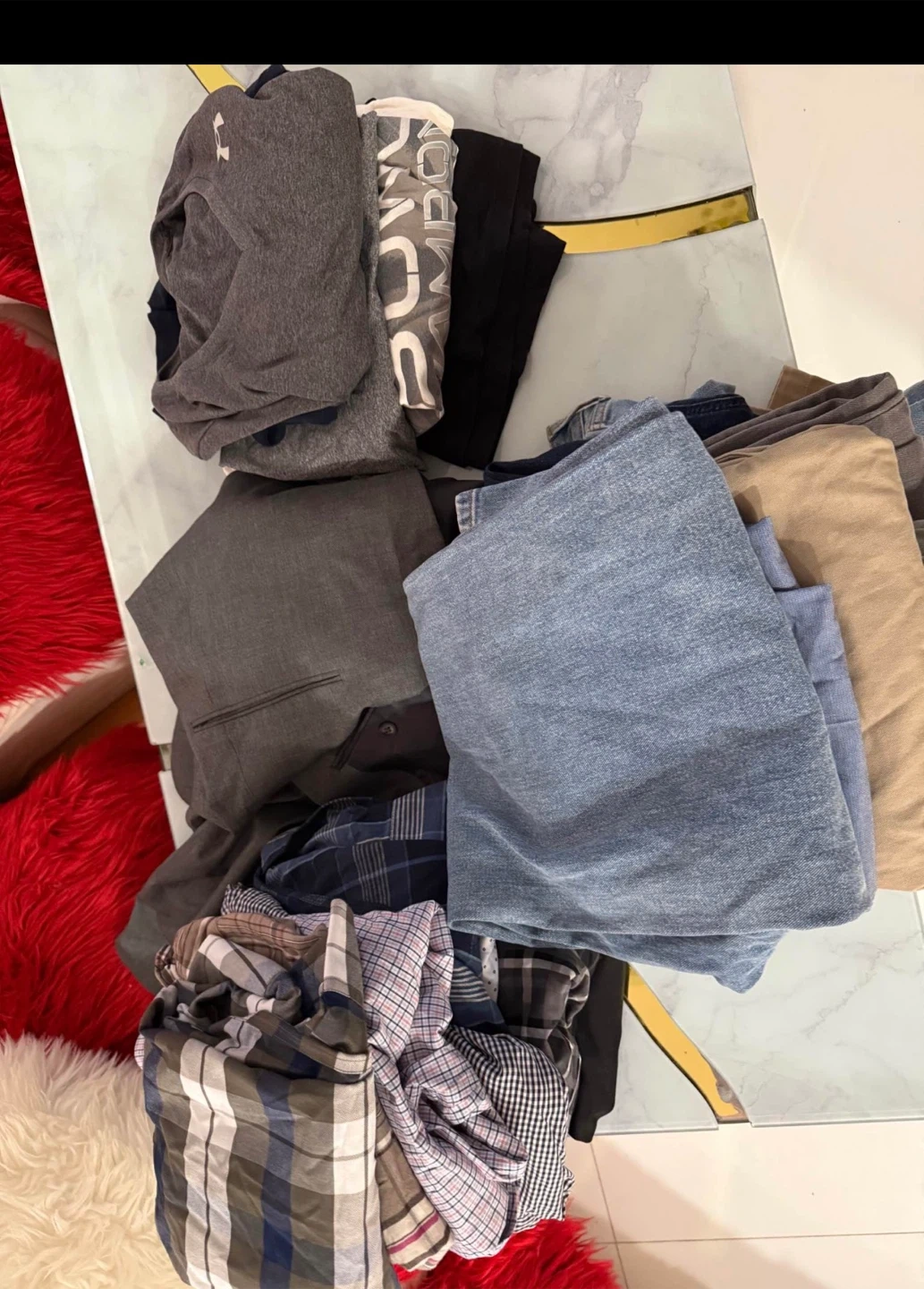 Bundle of men's clothing including shirts, shorts, and a jacket. Features brands like Under Armour and Dockers. Various colors and plaid patterns. Most items appear to be size medium.