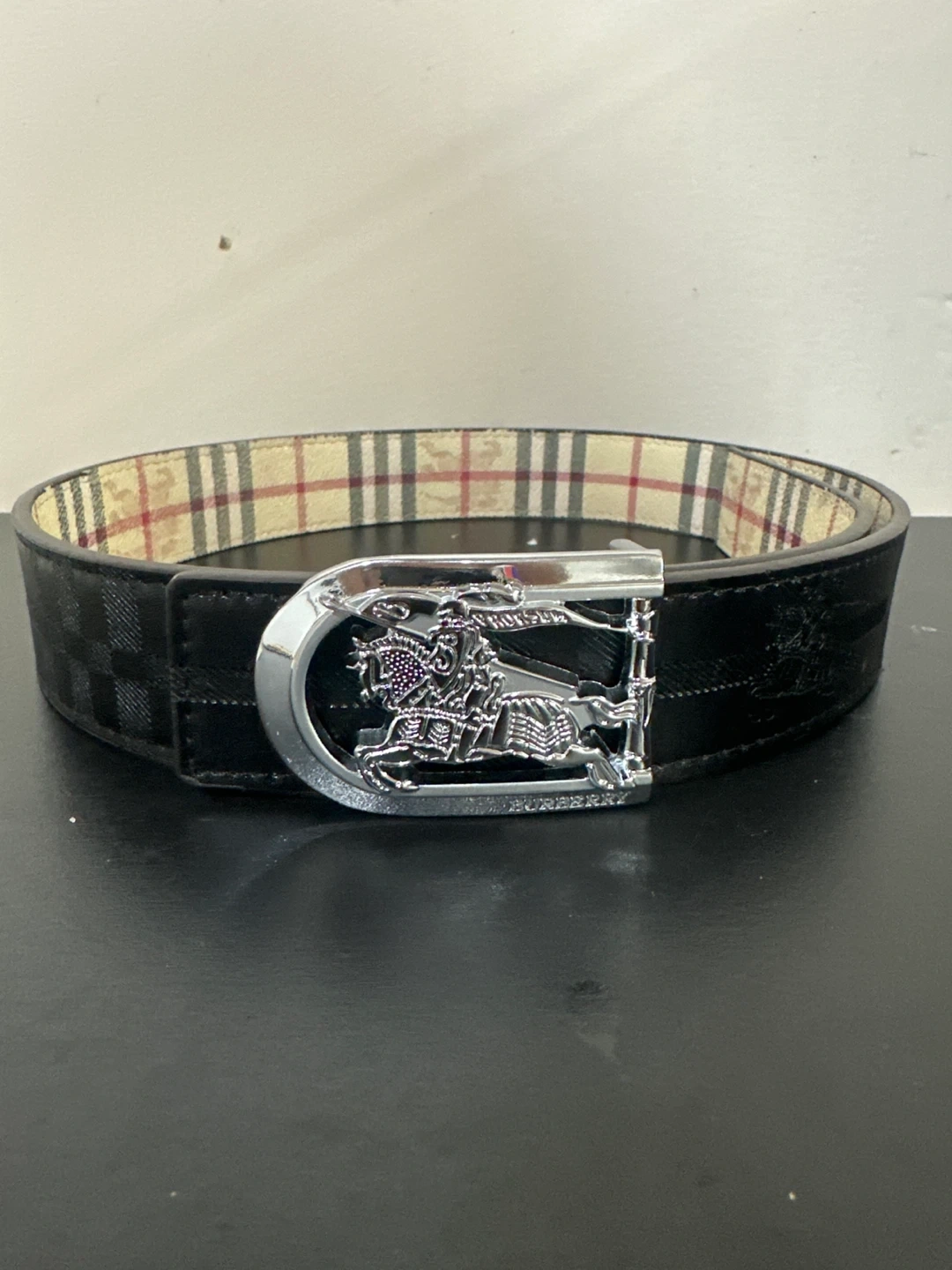 Burberry reversible belt featuring the iconic Nova Check pattern on one side and black checkered pattern on the other. It's finished with a polished silver-tone buckle showcasing the Equestrian Knight emblem. A stylish accessory for any wardrobe!