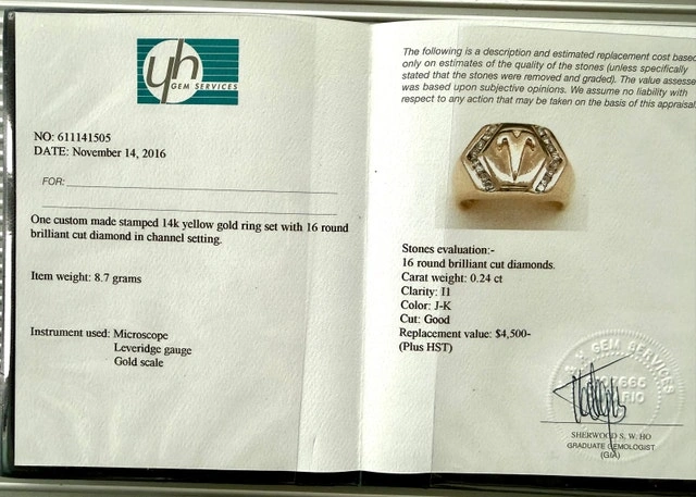 This custom-made 14k yellow gold ring features 16 round brilliant-cut diamonds in a channel setting, with a total carat weight of 0.24 ct, Clarity: I1, Colour J-K, and a good cut. The item weight is 8.7 grams. The original replacement value was appraised at $4,500 (plus HST). Specifications: Metal: 14k Yellow Gold Stones: 16 Round Brilliant Cut Diamonds Total Carat Weight: 0.24 ct Clarity: I1 Colour: J-K Cut: Good Weight: 8.7 grams. If the ad is up, the item is available. Cash accepted.