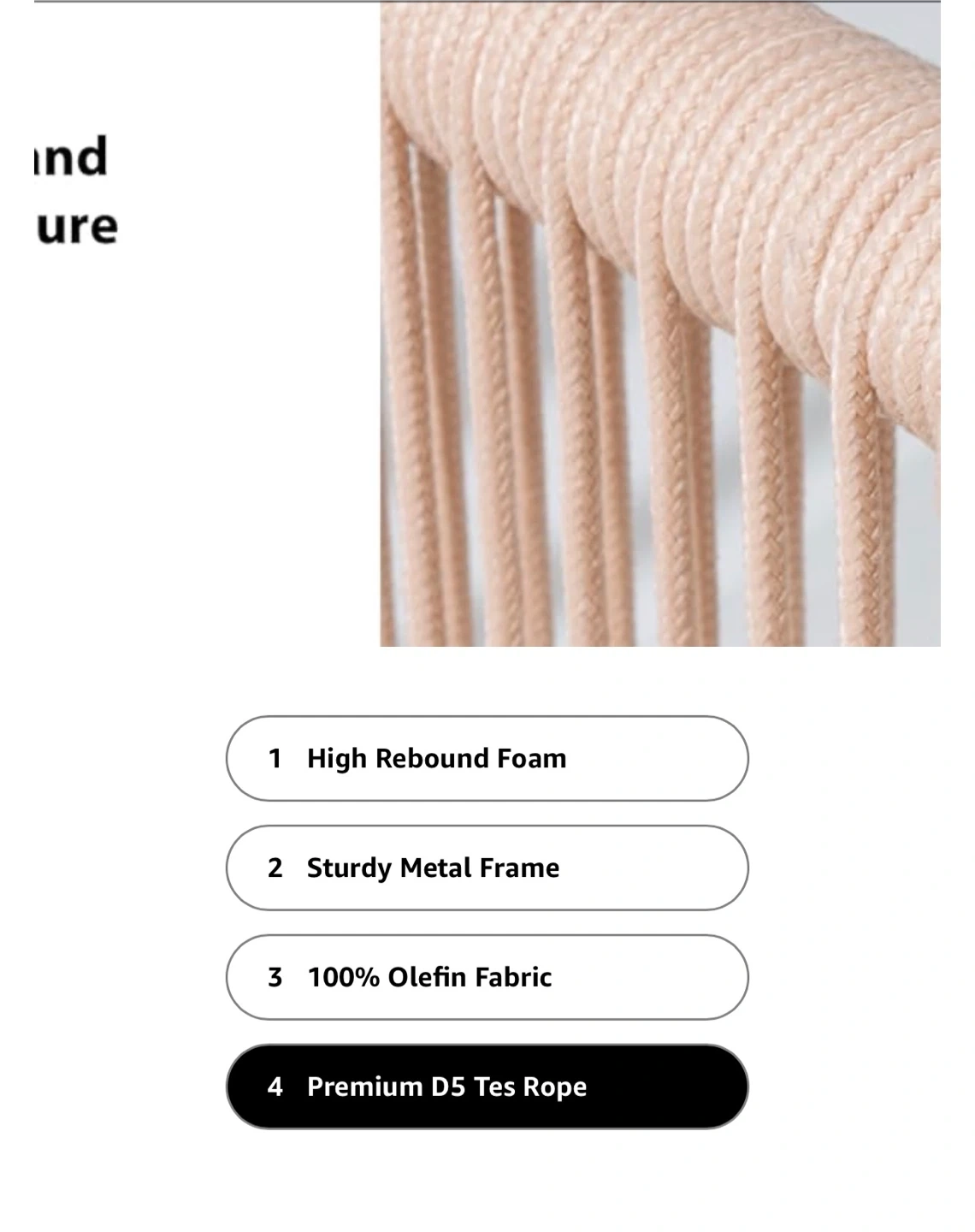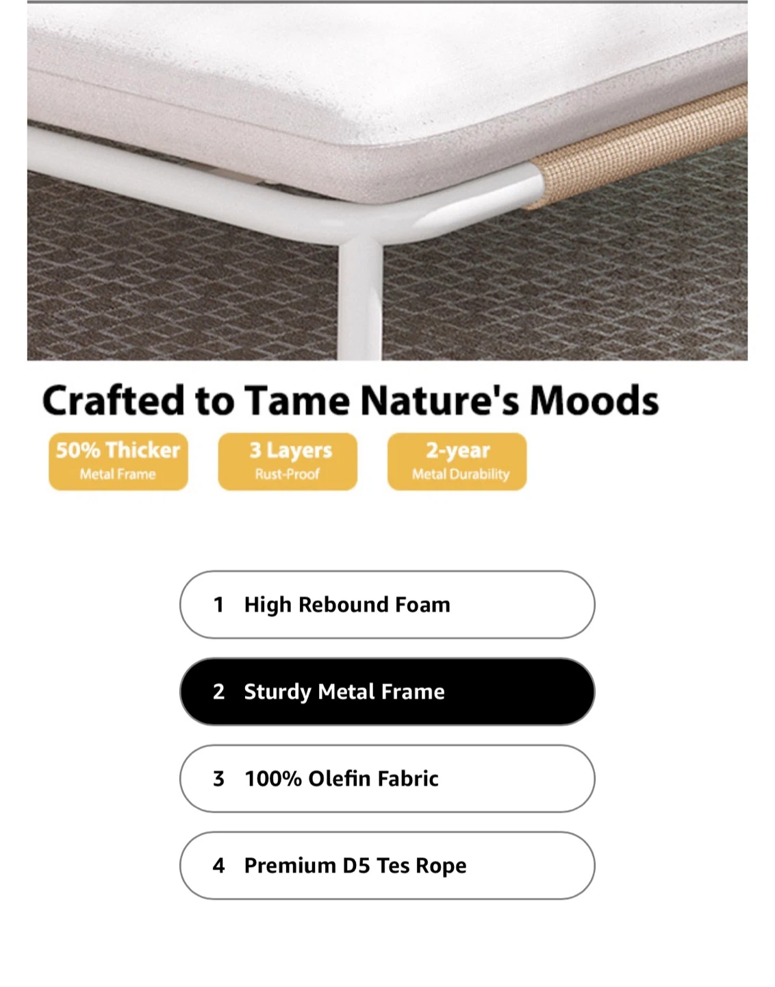 This modern outdoor lounge chair is perfect for relaxing! It features a sturdy metal frame and is crafted with 100% Olefin fabric and premium D5 Tes Rope. The cushion is made with high rebound foam for lasting comfort and luxurious softness. The chair measures approximately 30.7 x 30.7 x 23.8 inches.