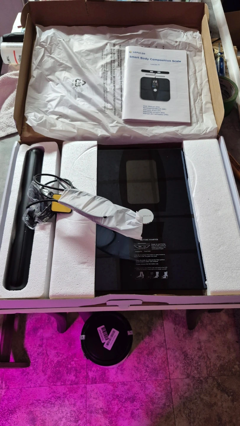This LEPULSE Lescale P1 smart scale tracks body weight, fat, BMI, and more. It comes in a sleek black design. Includes original box and user manual.PRECISION BODY POD SCALE: Unlike other 4 electrode body weight scales for people, which only measure half of the body, Lepulse rechargeable body scale comprehensively measure 5 segmental of your body (4 limbs and torso) for 8-electrode Dual-frequency BIA technique. ITO coated sensor area fits all foot size