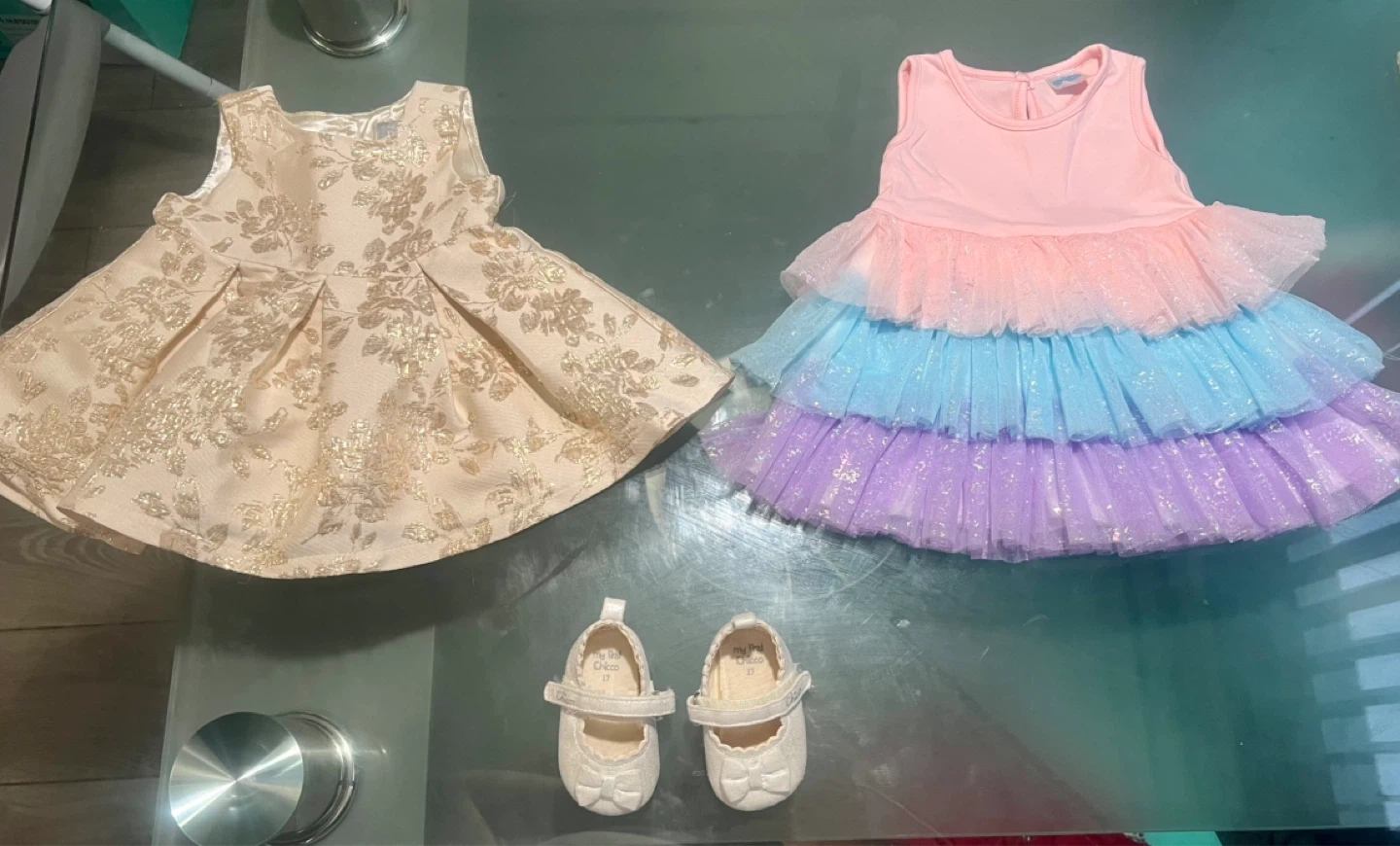 Includes a gold floral print dress and a pink, blue, and purple tiered tulle dress. Also comes with white sparkly shoes with a bow detail.