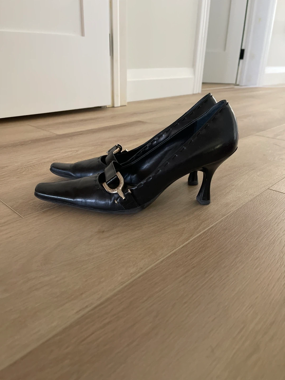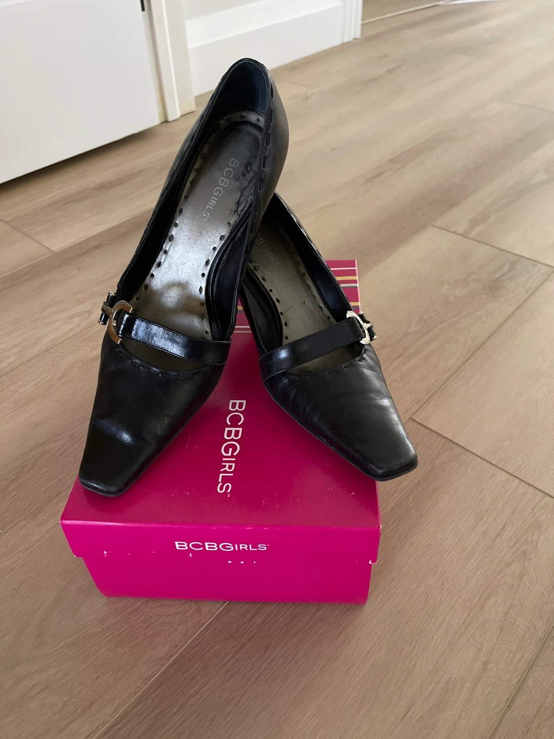 BCBGirls black leather heels with a decorative buckle. These pumps have a pointed squared-off toe and a mid-height heel. Includes original box.