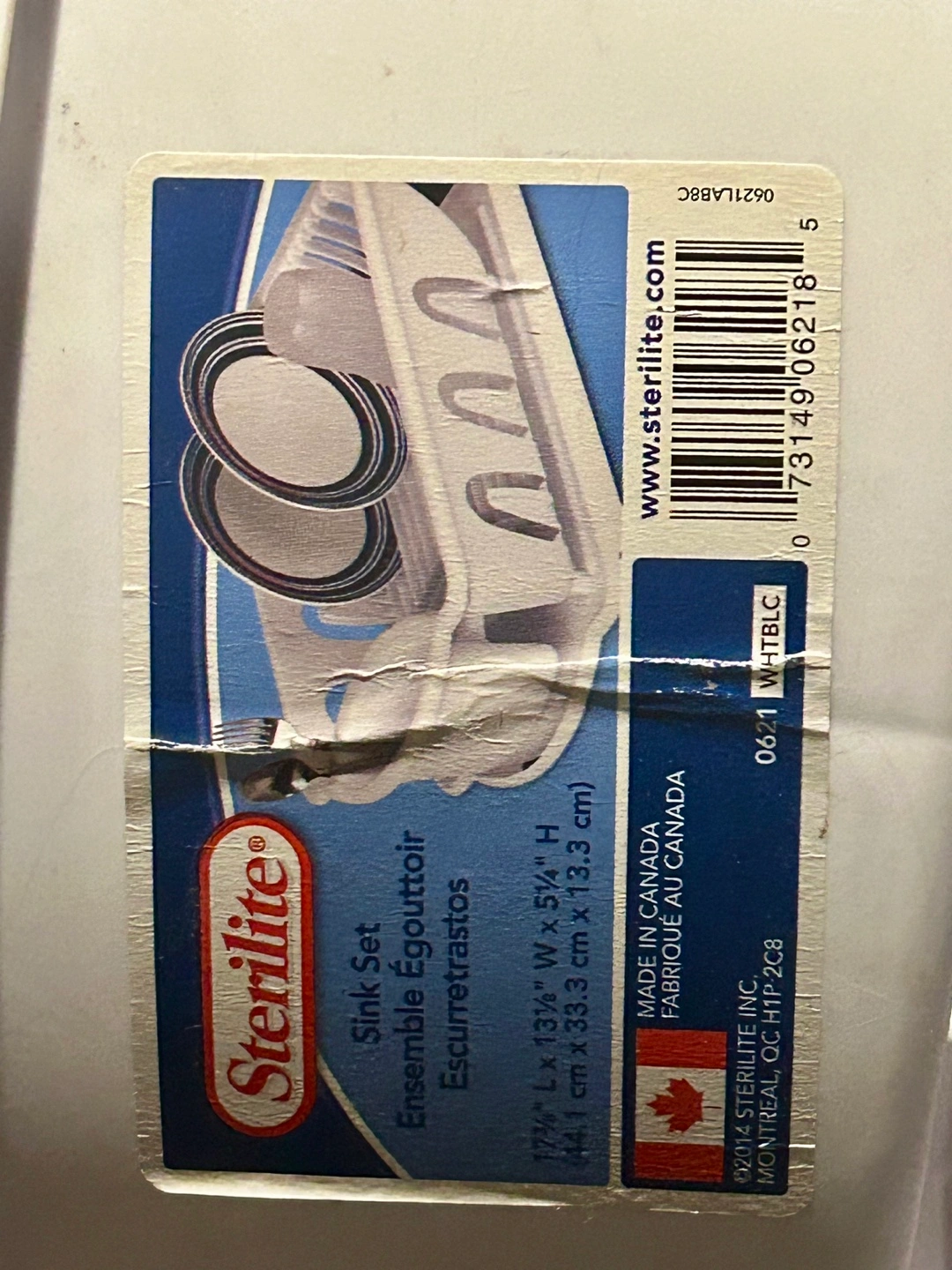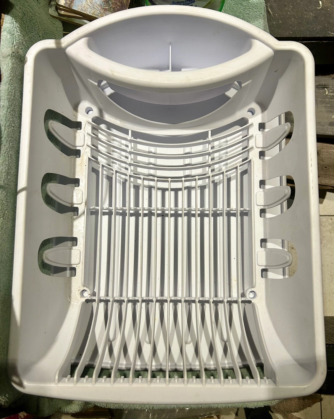 White plastic dish drying rack and drainboard. Nesting design. Ideal for kitchens. Made in Canada.