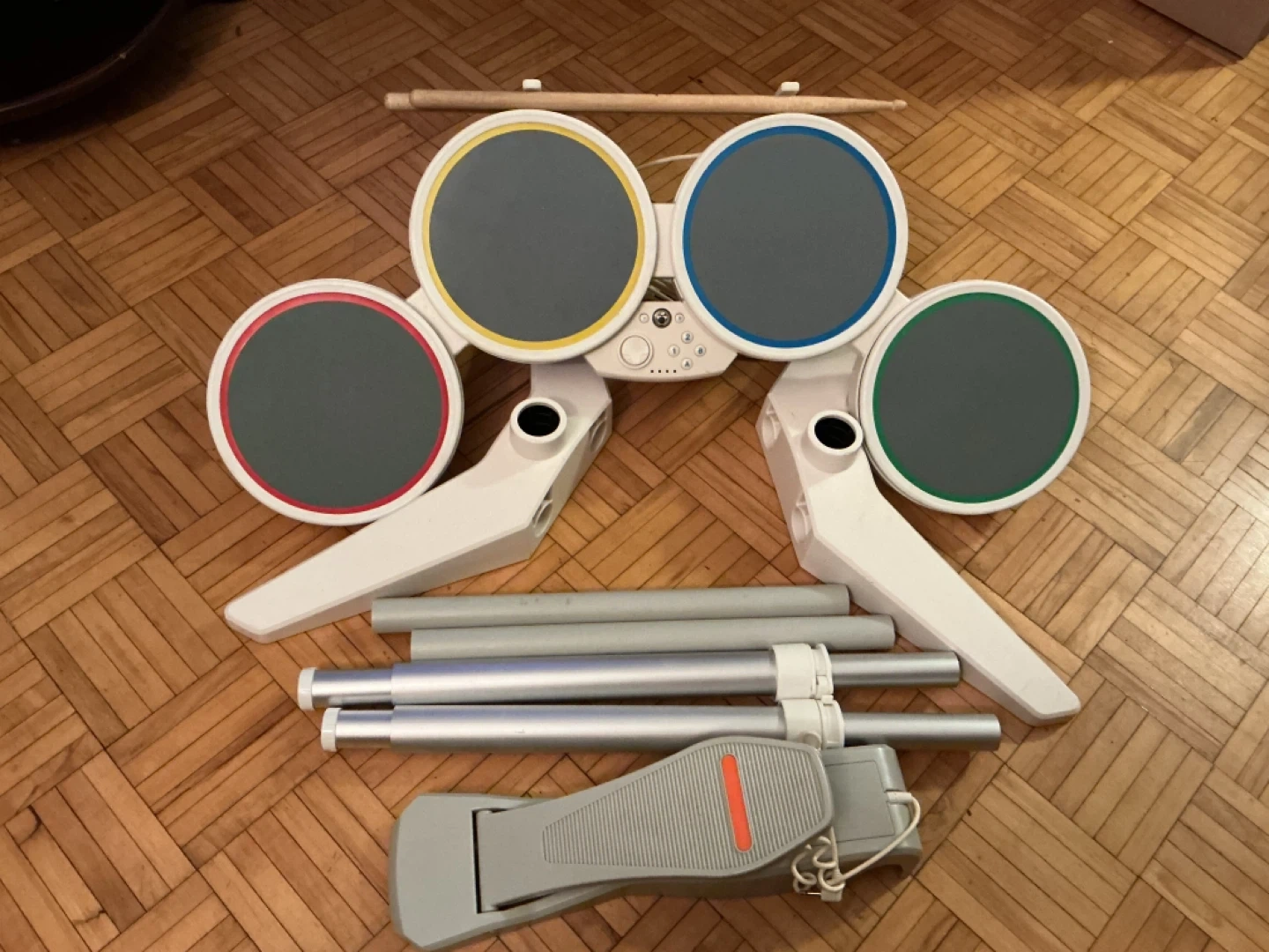 This is a Rock Band drum set. It includes the main drum unit, a kick pedal, and drum sticks. The drum pads have coloured rims: red, yellow, blue, and green.