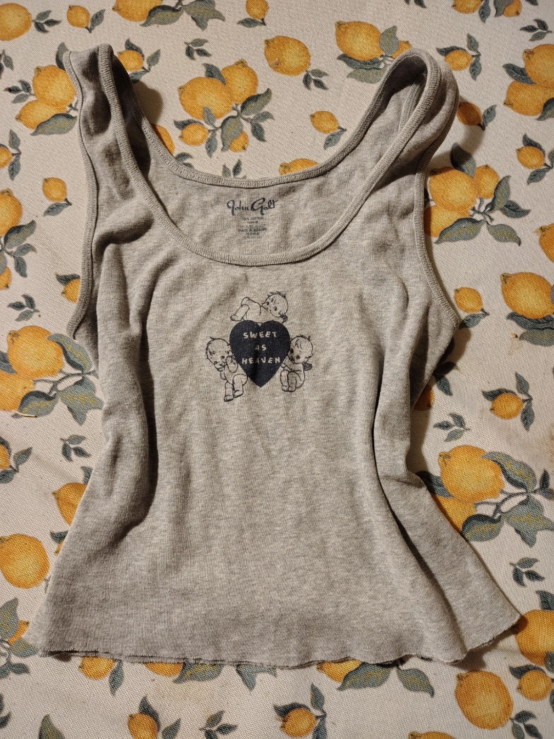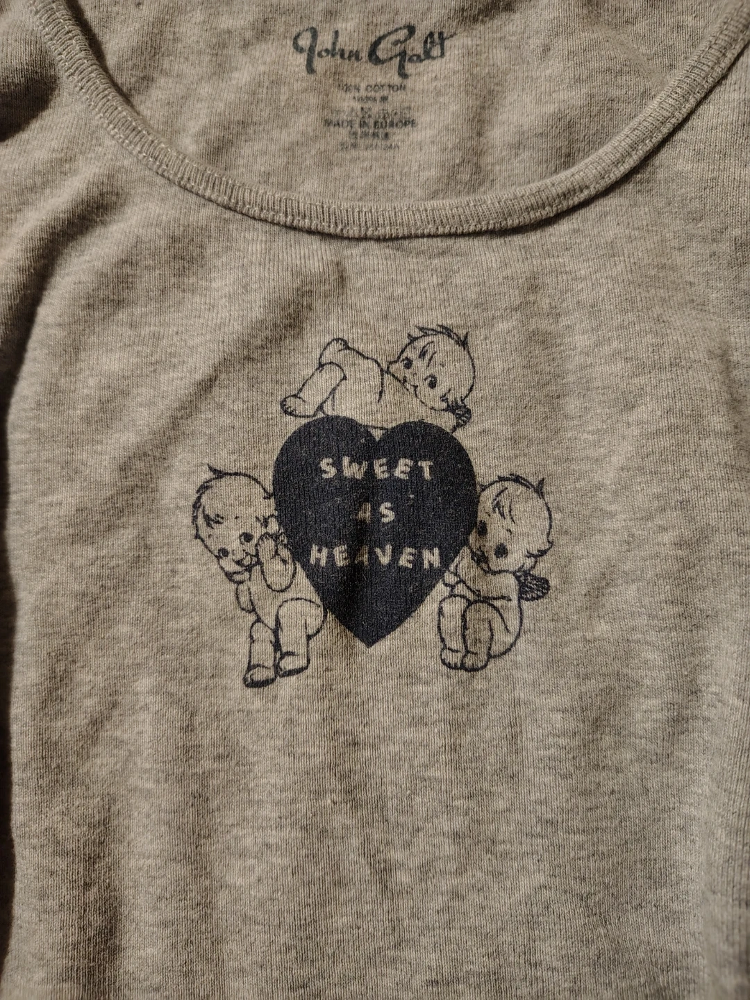 This grey John Galt tank top features a black heart graphic with cherubs and the text "SWEET AS HEAVEN". It's made from a soft cotton blend. A cute top for casual wear!