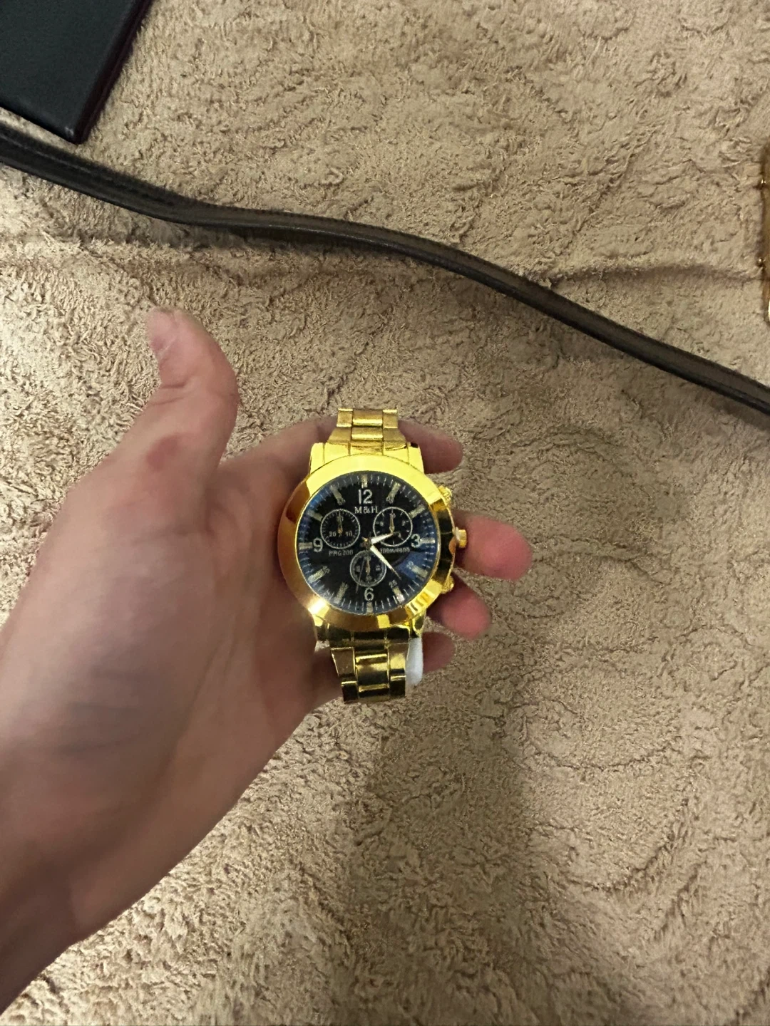 M&H chronograph watch with a gold-tone finish and a black dial. It features a metal band and a classic design. This watch has sub-dials for stopwatch functions. Great for everyday wear!