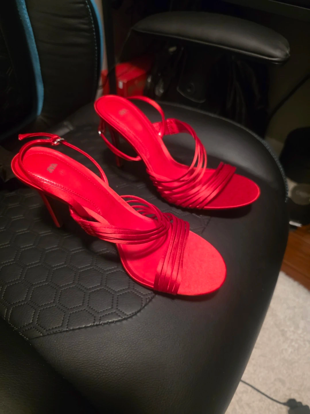 Women's red strappy heeled sandals. Satin material with a delicate criss-cross strap design. Features an adjustable ankle strap for a secure fit. These heels add a pop of colour to any outfit!