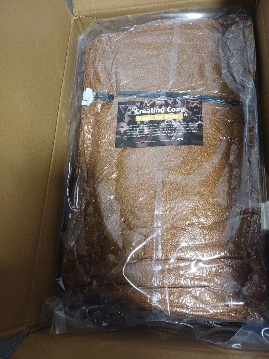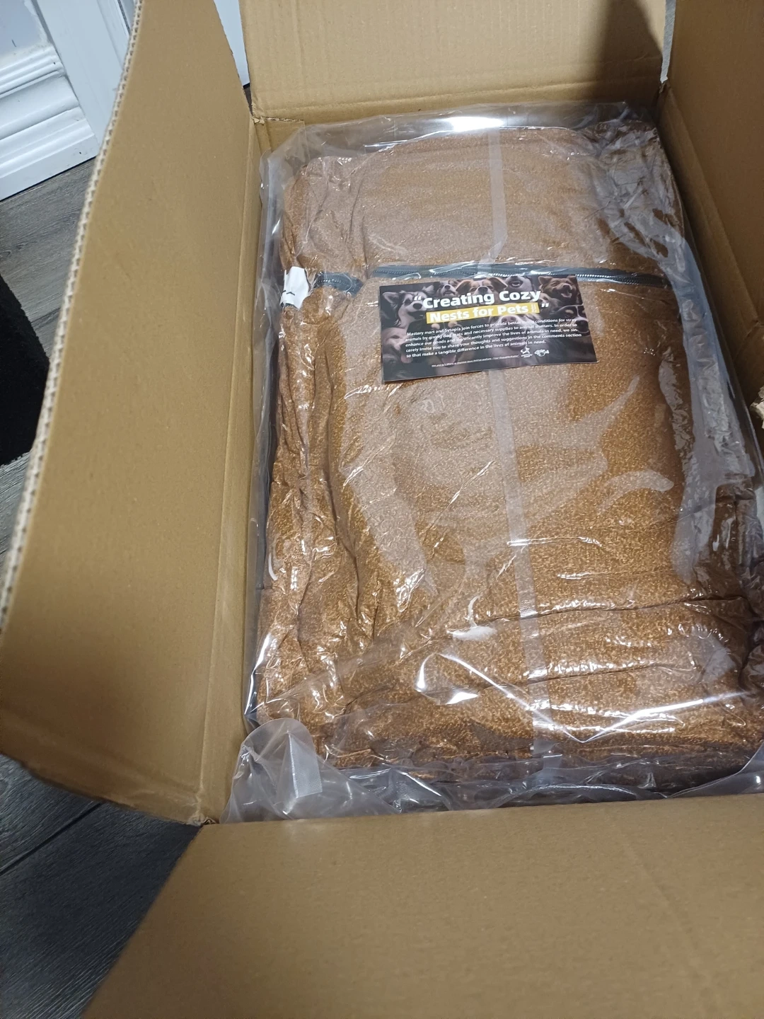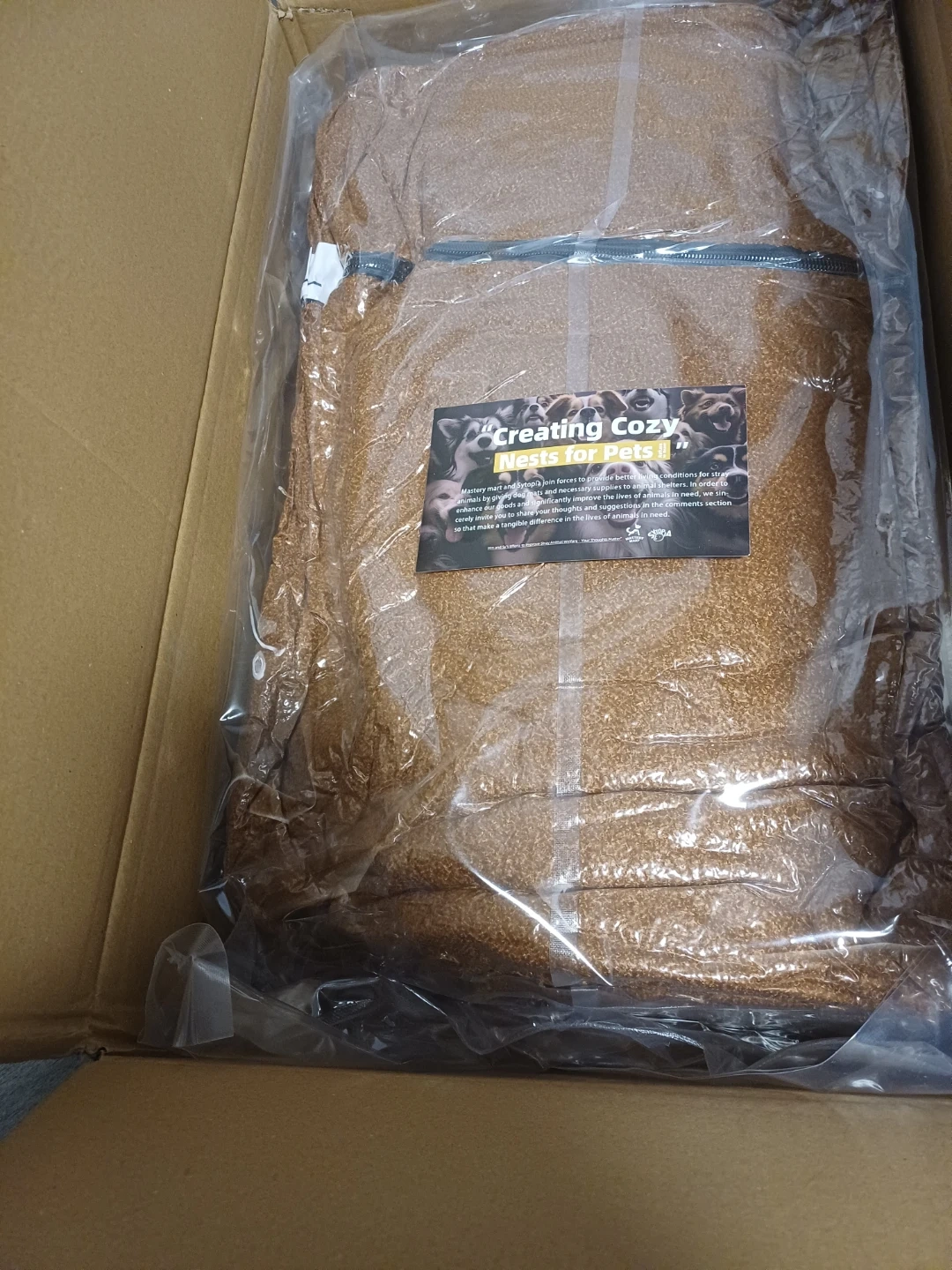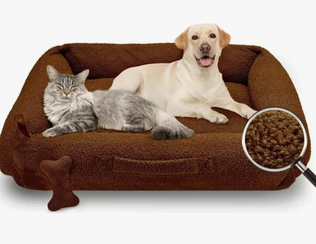 This cozy pet bed which is a lovely brown colour. It's approxinately 42-inch bed, perfect for larger dogs. The plush material will keep your pet comfortable!