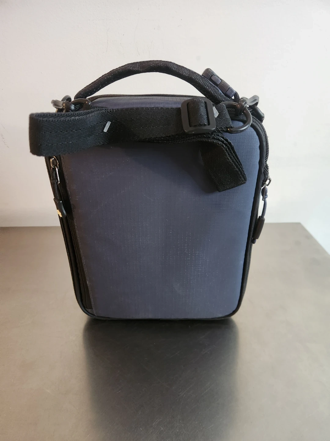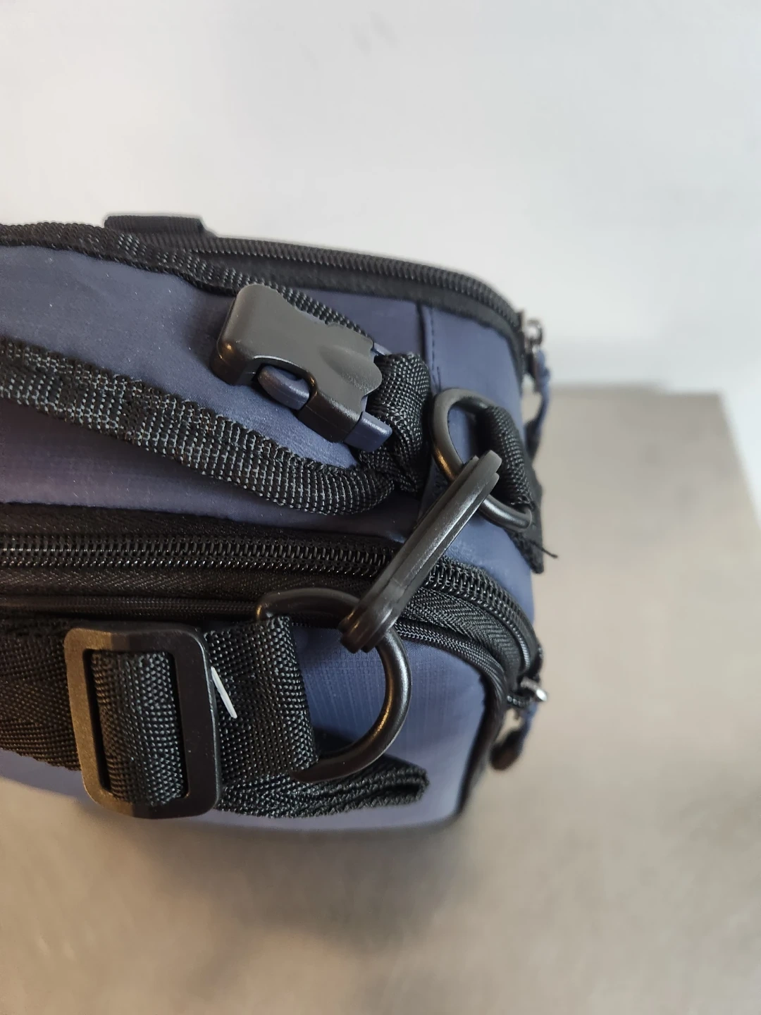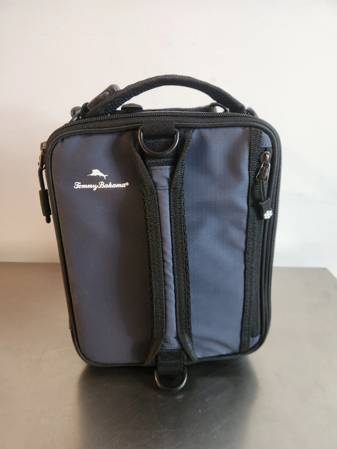 This is a Tommy Bahama blue camera bag. It's made of durable nylon material. The bag has a padded interior and a zippered main compartment, plus an exterior zippered pocket. It includes a top handle and a detachable shoulder strap.
