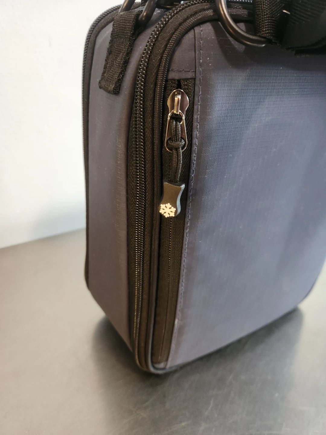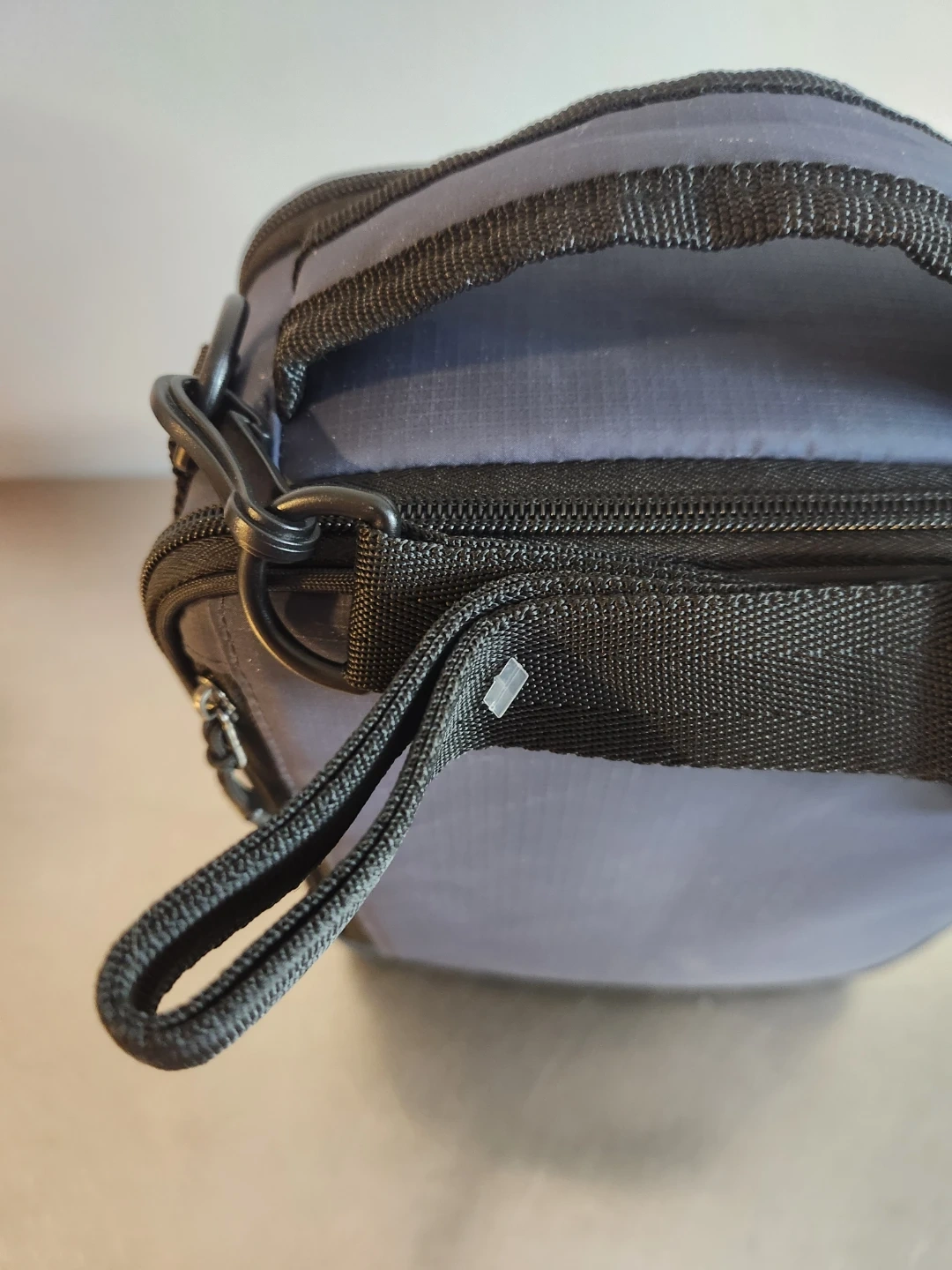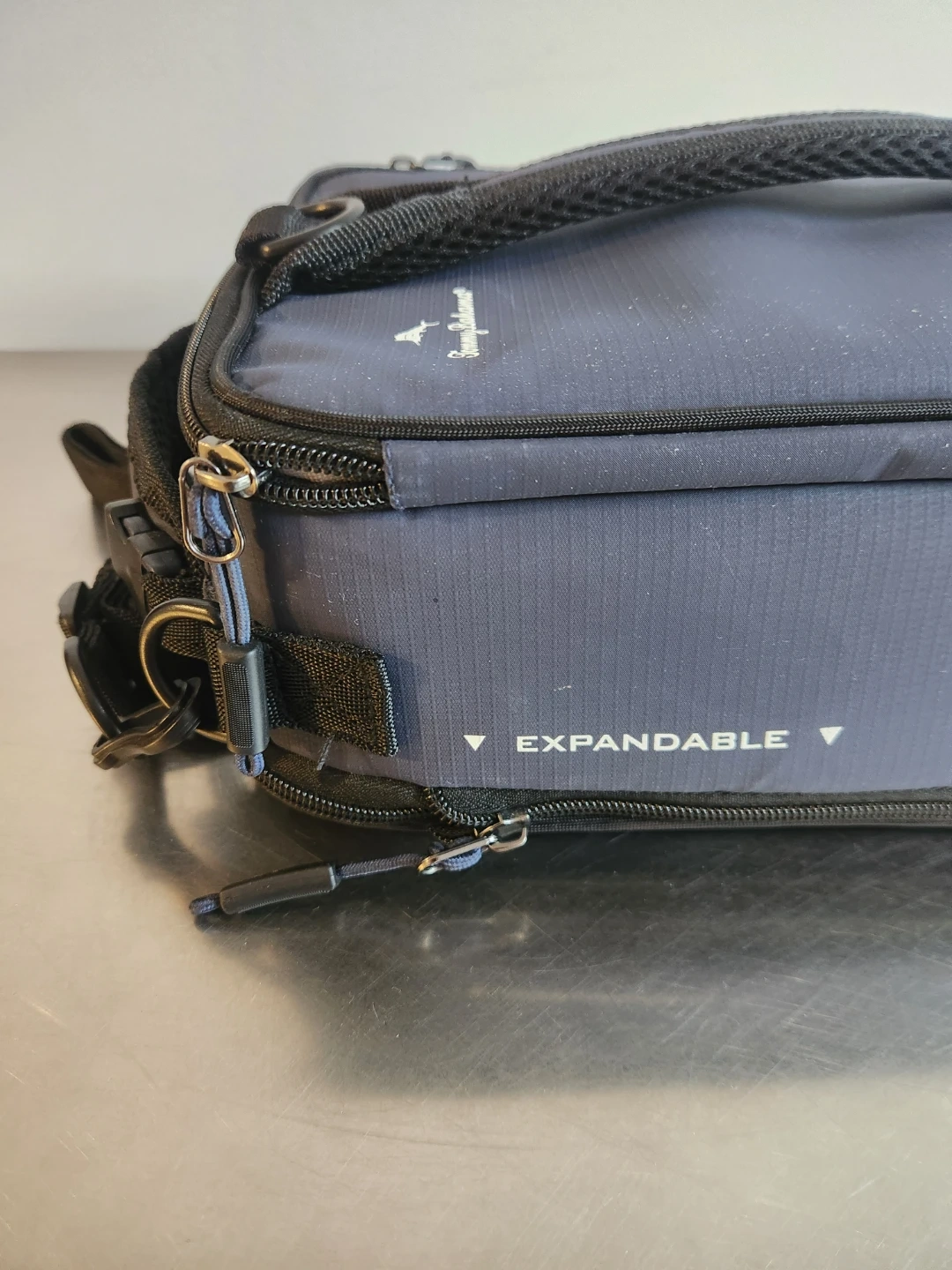 This is a Tommy Bahama blue camera bag. It's made of durable nylon material. The bag has a padded interior and a zippered main compartment, plus an exterior zippered pocket. It includes a top handle and a detachable shoulder strap.