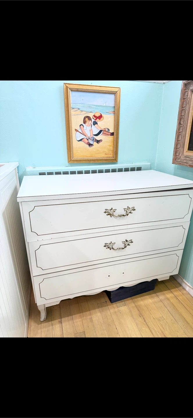 Smaller dresser measures 36 inches long by 18 inches wide by 30 inches tall. Smaller dresser has three long drawers. available for pick up only.
