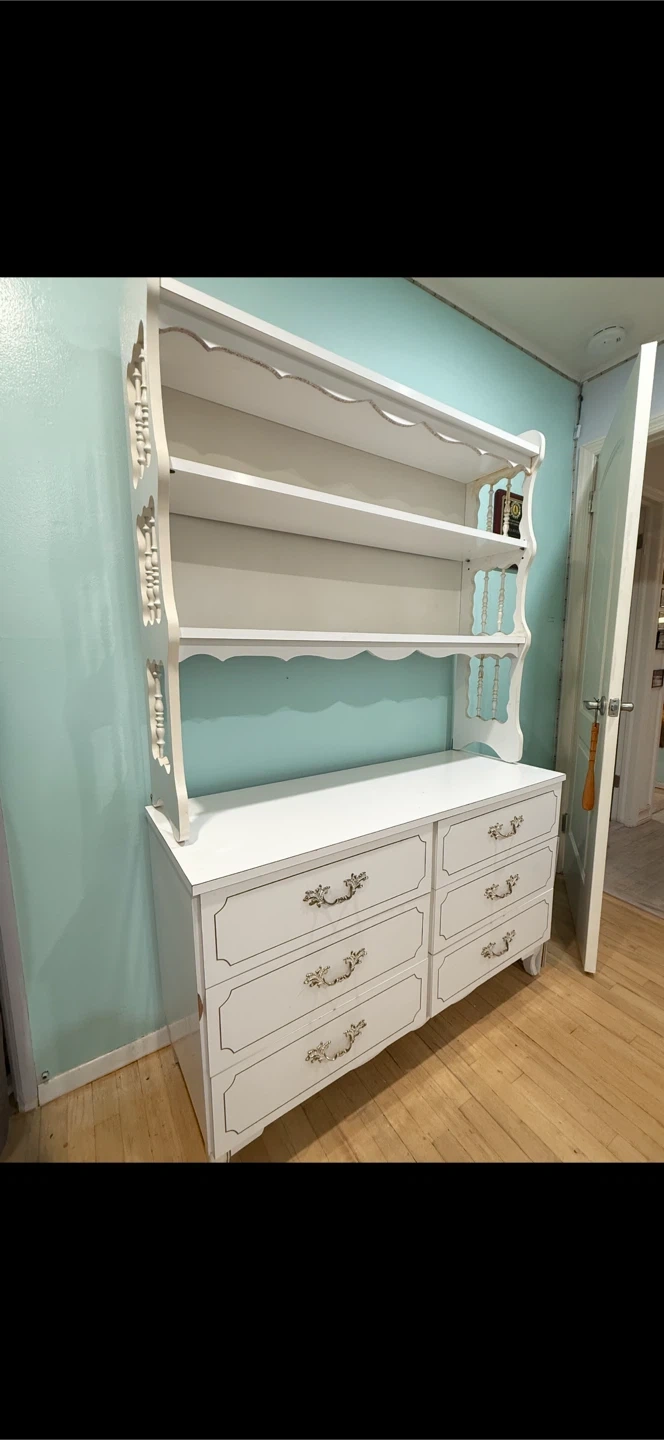 This white dresser features six drawers with decorative hardware and a hutch with three shelves. It's perfect for storing clothes or displaying decor. The piece has a classic design with some vintage flair. large dresser and small dresser for sale $150 total large Dresser measures 48“ x 18“ x 30“ . detachable bookshelf/hutch measures 48“ long x 11“ wide.x 46” tall