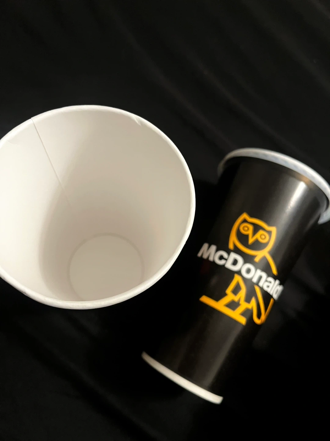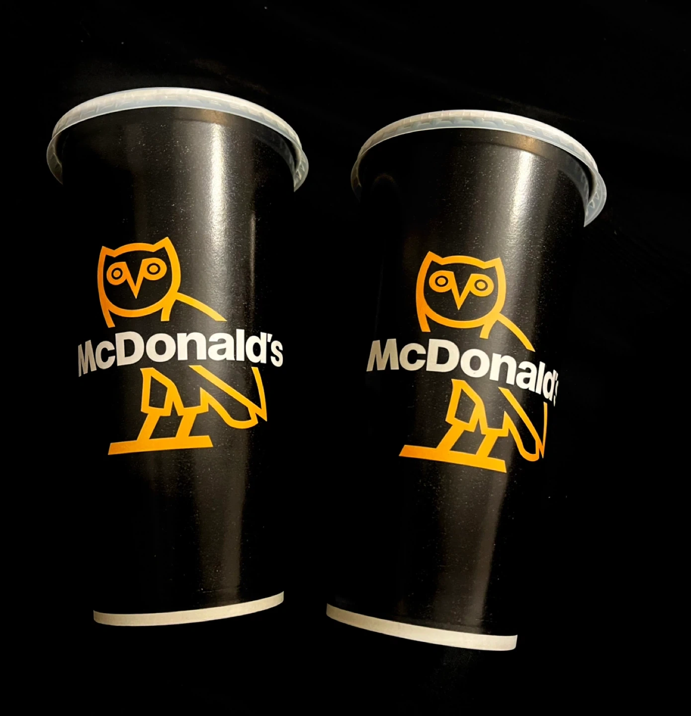 Two black paper cups featuring the McDonald's and OVO owl logo. These collectible cups are perfect for fans of both brands. Great for display or use!