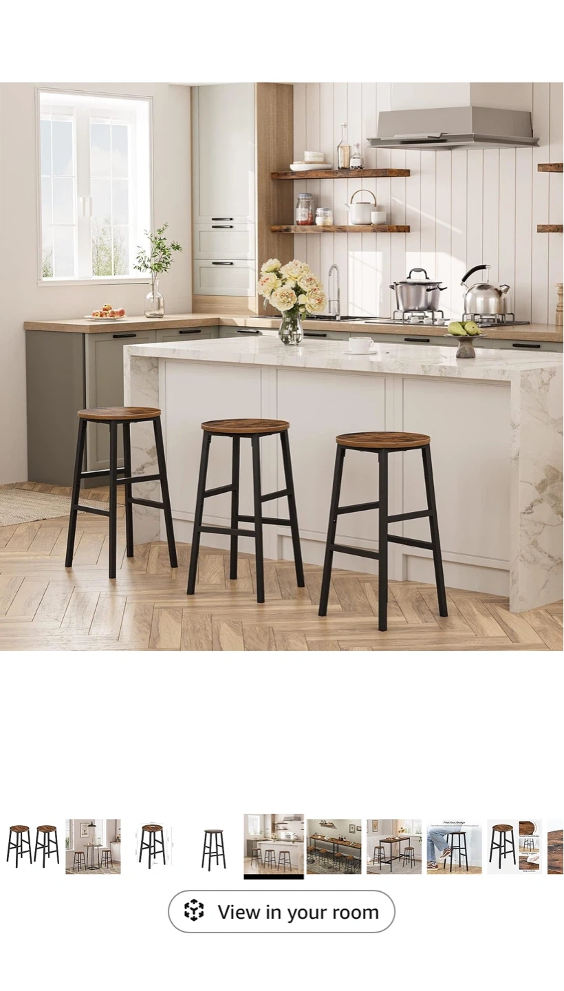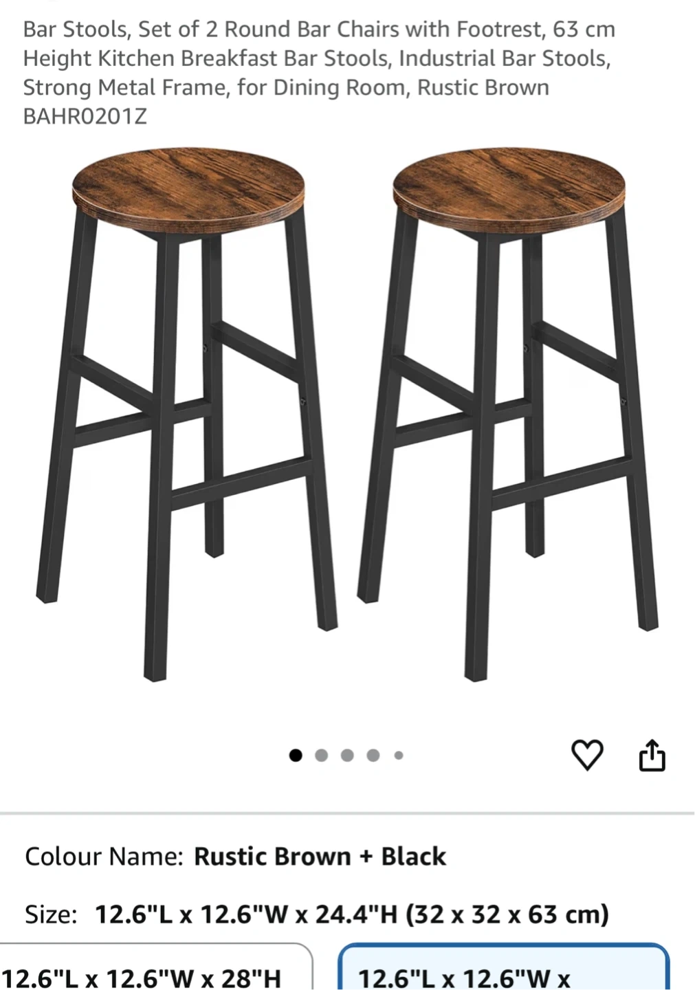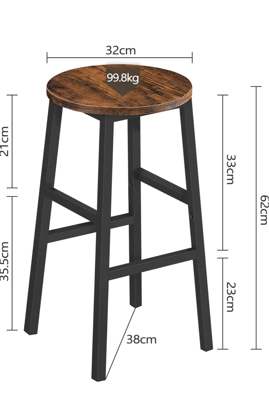 This set includes two round bar stools with a rustic brown wood-look seat and black metal frame. Each stool measures 32 cm in diameter and has a height of 63 cm. These stools are great for your kitchen or dining area!