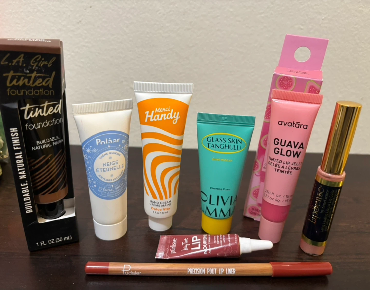 This lot includes L.A. Girl tinted foundation in a buildable, natural finish, 1 fl oz (30 mL). It also contains a Polaar Neige Éternelle cream, Merci Handy hand cream (1 fl oz / 30 mL), a Pürisse lip treatment, Olivia S. Glass Skin Tanghulu cleansing foam, and an Avatara Guava Glow tinted lip jelly (0.51 fl oz / 15 mL). A Pudaier Precision Pout Lip Liner is also included.