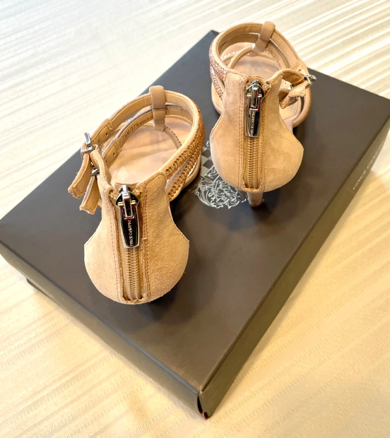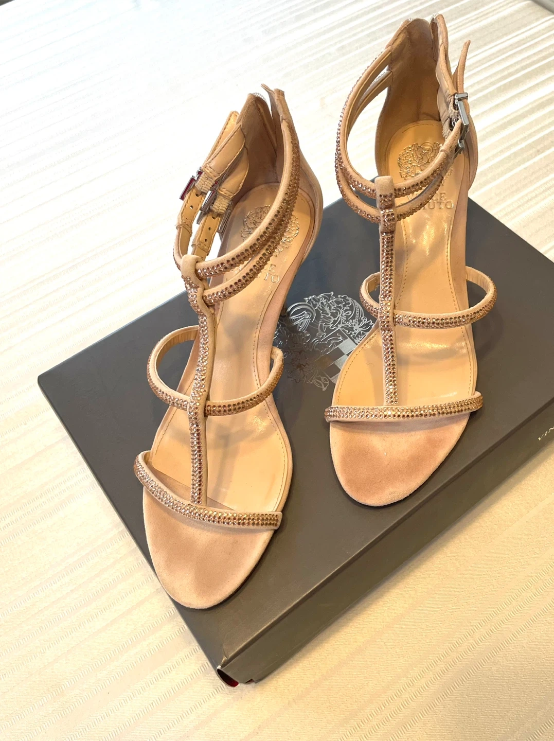 Vince Camuto women's heels. These strappy sandals feature a nude suede finish with sparkling rhinestone embellishments. They have a back zipper closure and a buckle strap for adjustability. Includes original box.