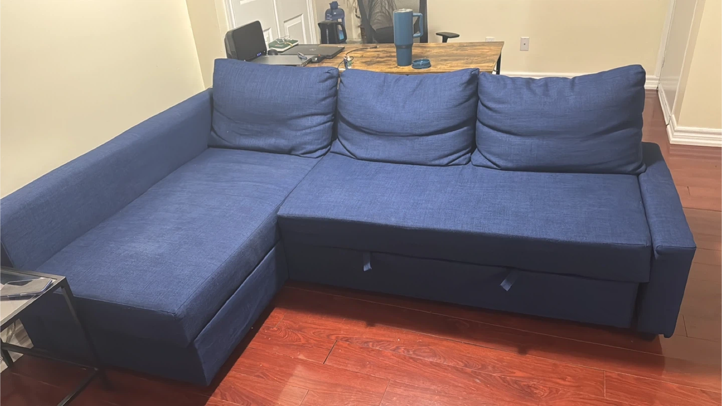 Dark blue sectional sofa that easily converts into a bed. It's upholstered in a textured fabric. Storage is available underneath the chaise section for blankets or pillows. Recently bought for $1000.